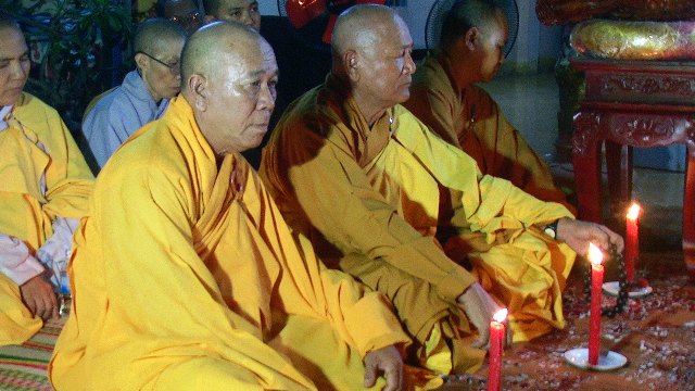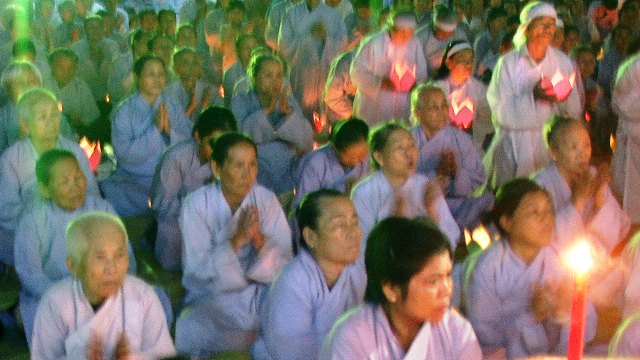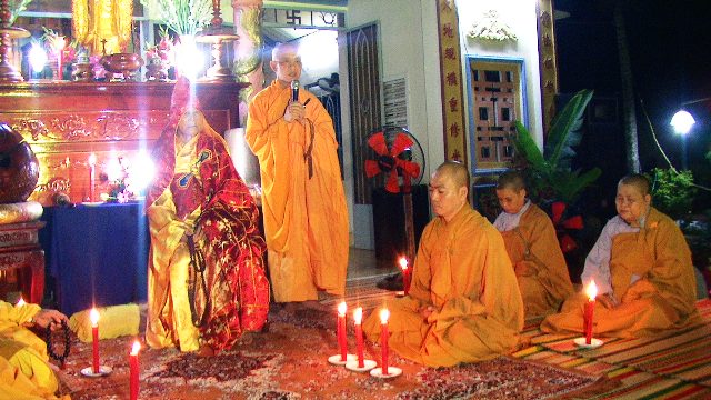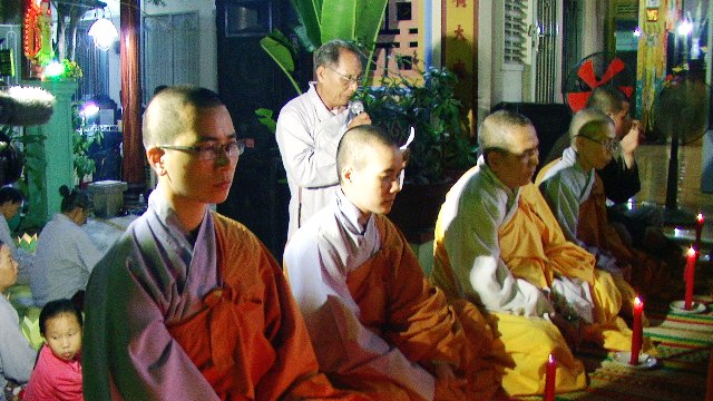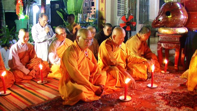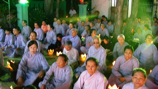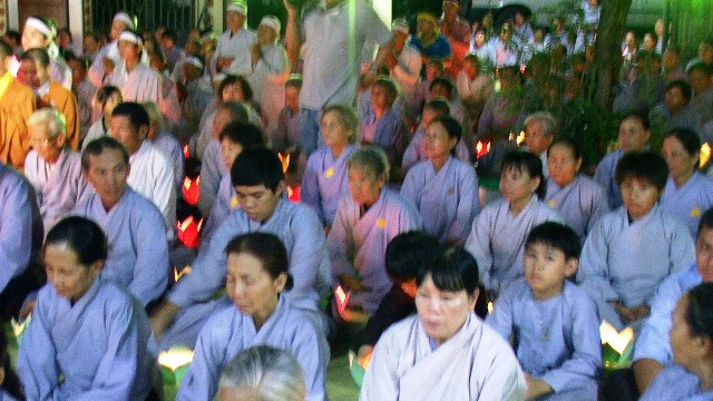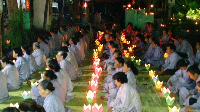 Trong không khí trang nghiêm thanh tịnh hàng ngàn ngọn hoa đăng được cháy bùng lên, ánh hoa đăng rực sáng xóa tan bầu trời đêm đen tối. Tiếng niêm Phật trầm hùng ngân nga, tiếng chuông, tiếng mõ, tiếng khánh nhịp nhàng đạo tràng thanh tịnh trang nghiêm nhất tâm cầu nguyện: cửu huyền thất Tổ siêu sinh Phật quốc, cầu cha mẹ hiện tiền Phước huệ song tu, quá vãng sinh về Tịnh độ.