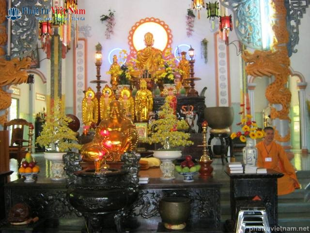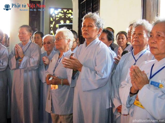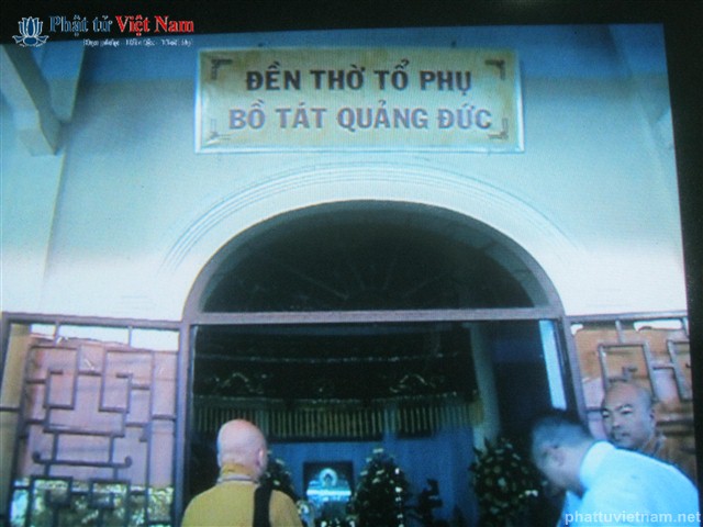 Sau hơn 2 giờ với hành trình 72 km, vào lúc 9 giờ đoàn hành hương đến viếng đền thờ Tổ phụ Bồ tát Quảng Đức, tại thôn Hội Khánh Đông, xã Vạn Khánh, huyện Vạn Ninh (Khánh Hòa).
