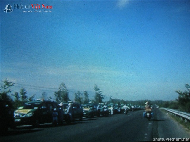 Đúng 6 giờ đoàn hành hương xuất phát, 70 chiếc xe màu xanh xếp thành hành dài như con rồng xanh đang uốn lượn trên quốc lộ 1 đoạn Khánh Hòa.