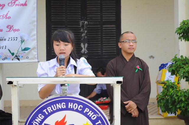 Thầy Phan Lèo, hiệu trưởng nhà trường bày tỏ sự xúc động và nhiệt liệt chào mừng cũng như cảm ơn các sư thầy cùng đoàn Phật tử đã giúp nhà trường tôn vinh tinh thần Hiếu đạo, tạo ra môi trường tinh thần tốt đẹp cho các học sinh có hướng đi tươi sáng hơn trong tương lai.