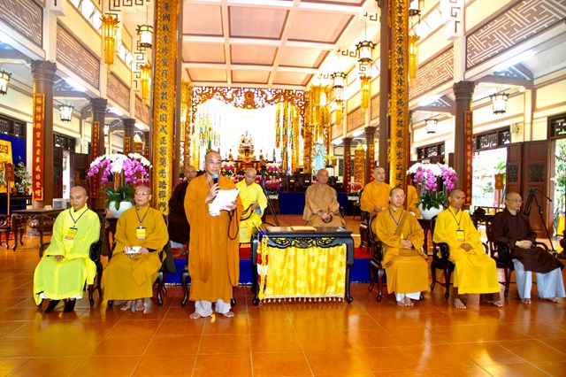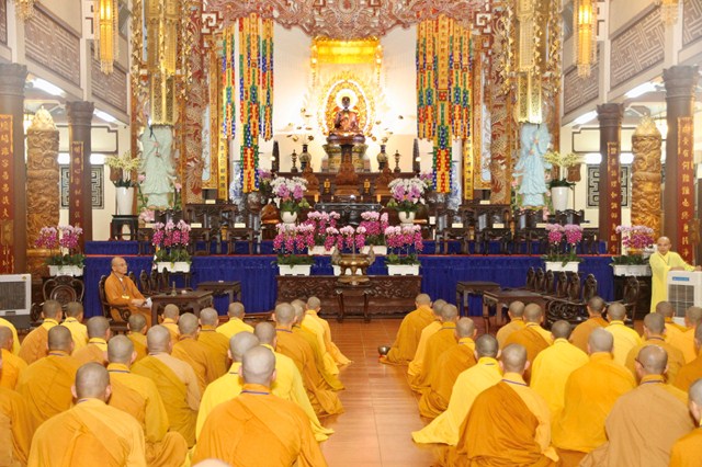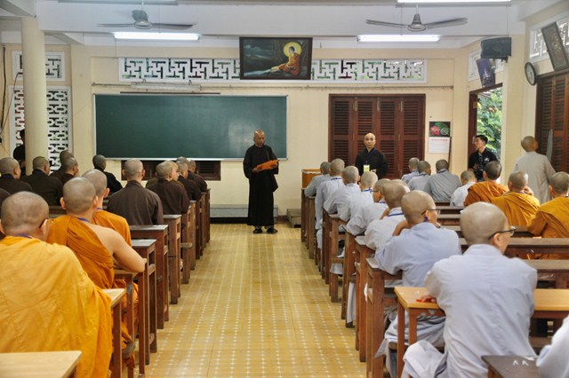 TT.Thích Huệ Giáo và TT.Thích Thiện Phước thay mặt Ban Kiến Đàn và Hội đồng Khảo thí Đại giới đàn công bố những nội quy về kỳ khảo hạch, những điều nên và không nên làm đối với giới tử để thể hiện tính công bằng trong kỳ thi tuyển người làm Phật tại Đại giới đàn Quảng Đức.