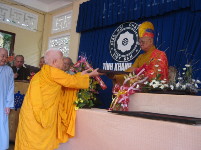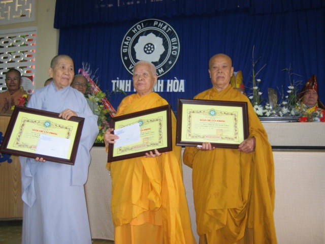 HT. Thích Ngộ Tánh, HT Thích Tịnh Diệu thay mặt Ban Trị sự PG Khánh Hòa đã dâng khánh vàng đề 4 chữ “Tòng Lâm Thạch Trụ” chúc mừng đức Phó Pháp chủ. Ban Hướng dẫn Phật tử và Phân ban đặc trách Ni giới, chư tôn đức Tăng Ni cũng đã dâng lẵng hoa chúc mừng HT Thích Thiện Bình, HT Thích Trí Tâm và HT Thích Như Ý..