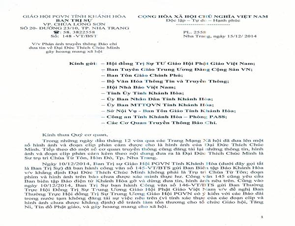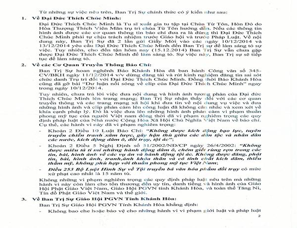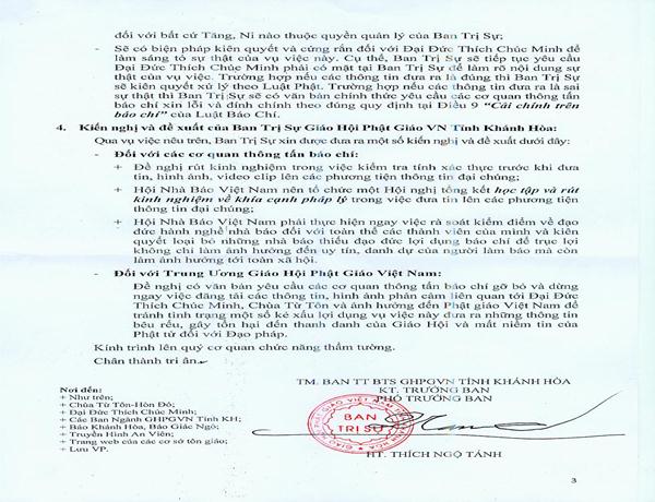 Văn thư trên cho biết GHPGVN tỉnh Khánh Hòa đã gửi 02 giấy mời đến Đại đức Thích Chúc Minh và tiếp tục gửi giấy mời để làm sáng tỏ sự việc. GHPGVN tỉnh Khánh Hòa khẳng định hoàn toàn “không có việc bao che” và “sẽ kiên quyết xử lý theo Luật Phật”, nếu thông tin, video clip và hình ảnh được chứng minh là đúng sự thật.