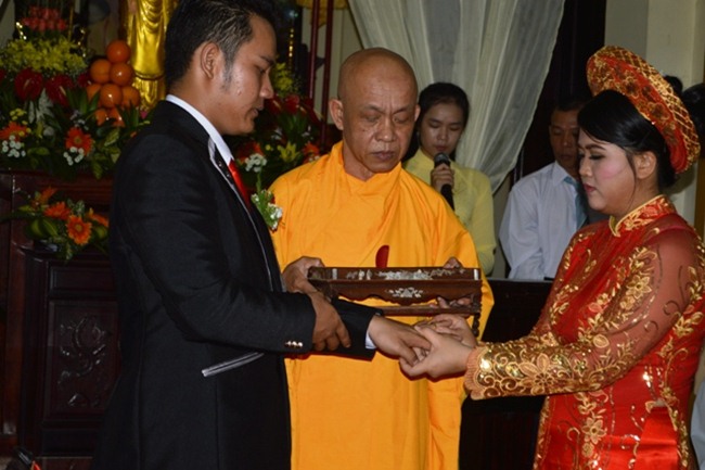 Thượng tọa Thích Quảng Tâm trao nhẫn cho tân nương và tân lang. Chiếc nhẫn cưới cô dâu, chú rể trao cho nhau trong ngày lễ thành hôn rất quan trọng. Bởi vì: “Nhẫn một chút – gió yên, biển lặng. Lùi một bước biển rộng trời cao”. Cô dâu và chú rể đã giao bái nhau thể hiện tôn trọng sự bình đẳng: nguyện chung sống trọn đời, thương yêu, bình đẳng với nhau.