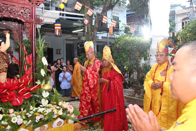 Sau khi tôn tượng hài nhi Đản sanh được cung rước về chùa Sắc Tứ Long Sơn an trí, chư tôn Hoà thượng chứng minh đã niêm hương đảnh lễ. TT.Thích Đức Thành, sám chủ buổi lễ cử hành nghi thức mộc dục kim tướng Như Lai, cung thỉnh chư tôn đức tuần tự làm lễ tắm Phật.