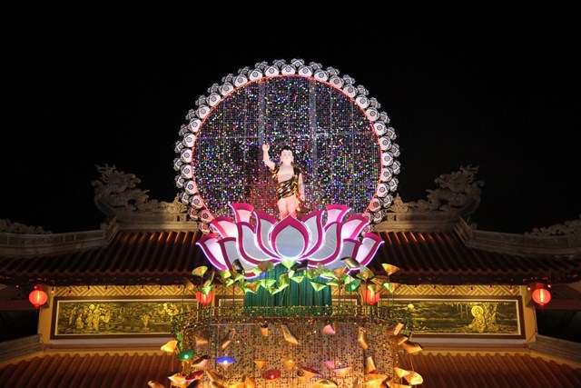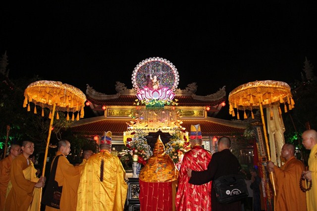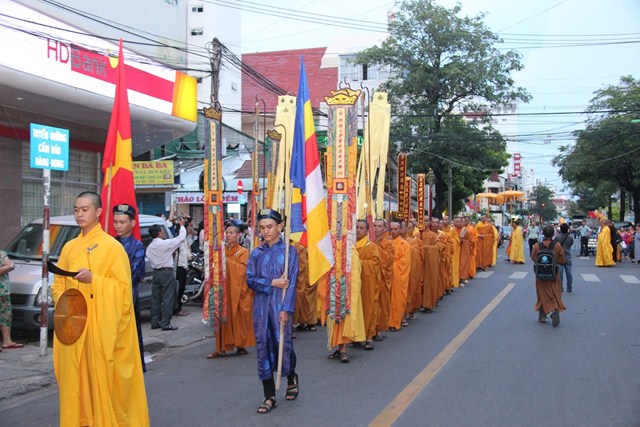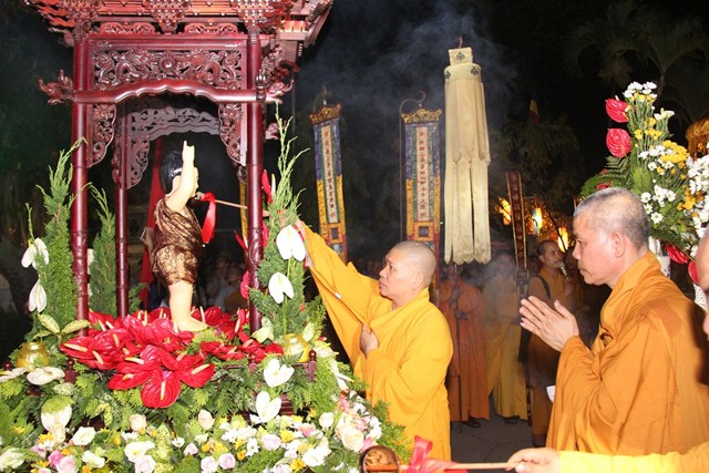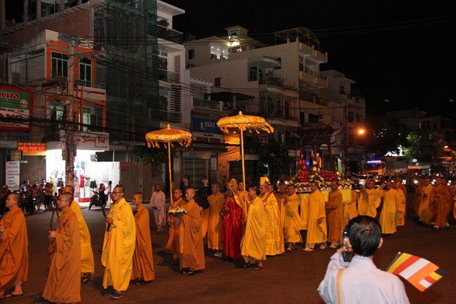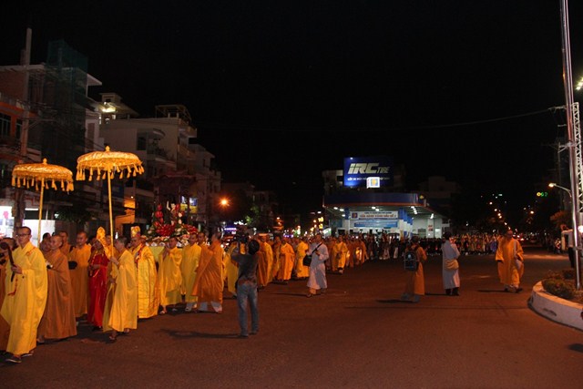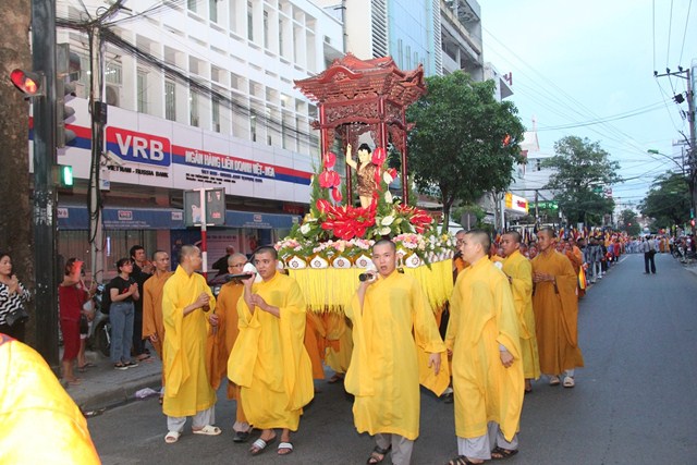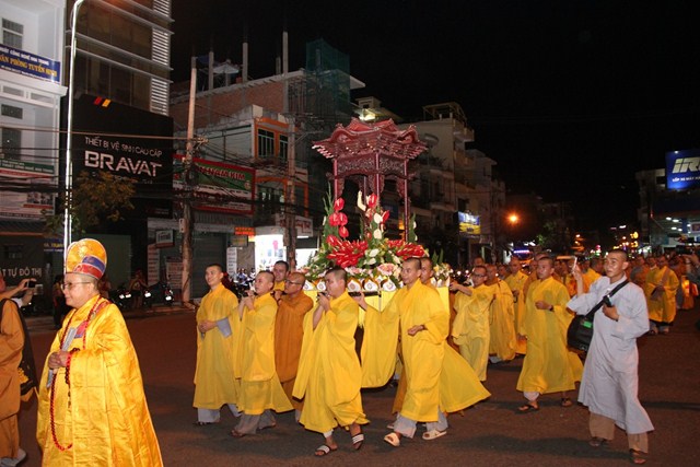 Đúng 17h30, chư tôn Hoà thượng chứng minh và Thượng Toạ sám chủ cử hành nghi thức niêm hương bạch Phật. Trong hồi chuông trống Bát Nhã trầm hùng, tôn tượng Đức Phật sơ sinh được từ từ cung rước ra các trục lộ giao thông trong thành phố theo lộ trình đã dự định (qua các đường Hoàng Văn Thụ, Lê Thành Phương, Thống Nhất, Quang Trung, Yersin, đường 23/10).