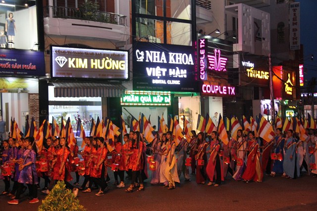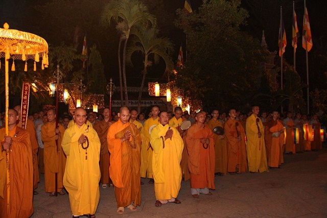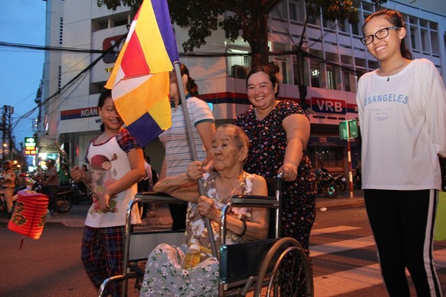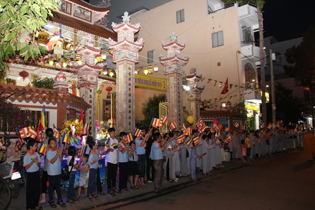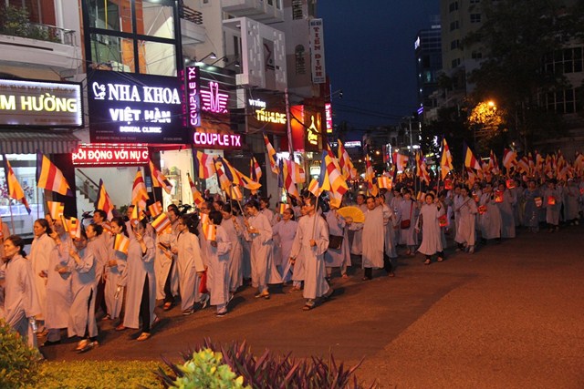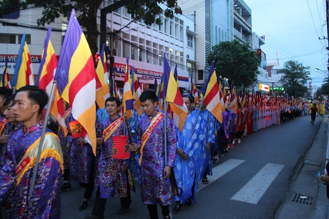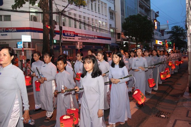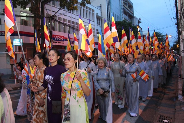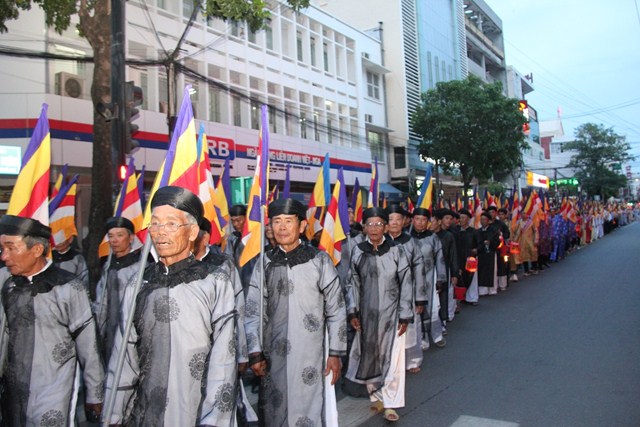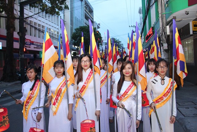 Đi đầu là đoàn nghi trượng cung nghinh, chư tôn Hoà thượng chứng minh, tiếp đến là kiệu Phật và chư tôn đức Tăng ni, theo sau là hơn 600 phật tử các giới hân hoan tay cầm cờ Phật giáo tung bay rực rỡ khắp một vùng trời. Từng bước chân an lạc với màu huỳnh y giải thoát, từng hàng tăng ni trang nghiêm chánh niệm diễu hành cung rước tôn tượng Đản sanh. Dọc theo hai bên đường, người dân xứ Trầm Hương đều dừng lại chiêm ngưỡng, tỏ lòng thành kính trước hình ảnh trang nghiêm của đoàn diễu hành rước Phật. Hình ảnh ấy như gợi lại ký ức về mùa Phật Đản cách đây tròn 55 năm (1963 – 2018), hàng trăm tăng ni, Phật tửxuống đường diễu hành cho cuộc tự thiêu vị pháp của Bồ tát Thích Quảng Đức tại Sài Gòn, đòi lại quyền tự do tín ngưỡng cho Phật giáo đồ bị đàn áp bởi chế độ độc tài Ngô Đình Diệm.
