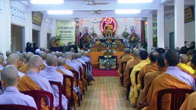 ĐĐ. Thích Nhật Hiếu, Chánh Thư ký trường TCPH, báo cáo kết quả đạo tạo khóa VI có 117 Tăng Ni sinh tốt nghiệp, gồm 77 Tăng sinh và 40 Ni sinh. Trong đó, tốt nghiệp loại Giỏi 28 %, Khá 47,1%, Trung bÌnh 21,4 % . HT. Thích Minh Thông-Hiệu trưởng đã trao bằng tốt nghiệp và phát thưởng cho Tăng Ni sinh xuất sắc khóa VI (2011-2014) về học lực và hạnh kiểm. Nhân dịp này nhà trường cũng đã phát thưởng cho Tăng Ni sinh xuất sắc, năm thứ nhất khóa VII (2013-2016).