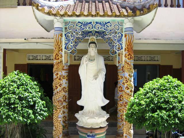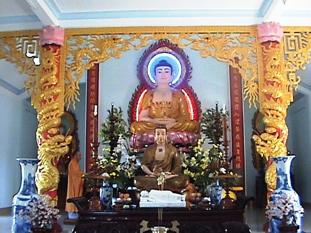 Bên trong cổng chùa là tương Phật A Di Đà lộ thiên phóng quang, nguyện tiếp độ chúng sinh về miền Cực Lạc.