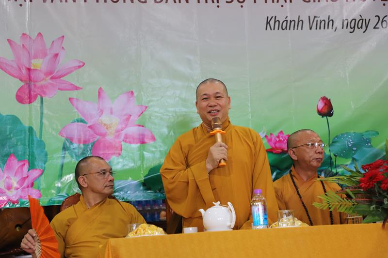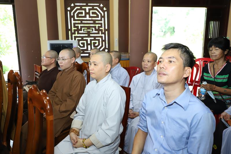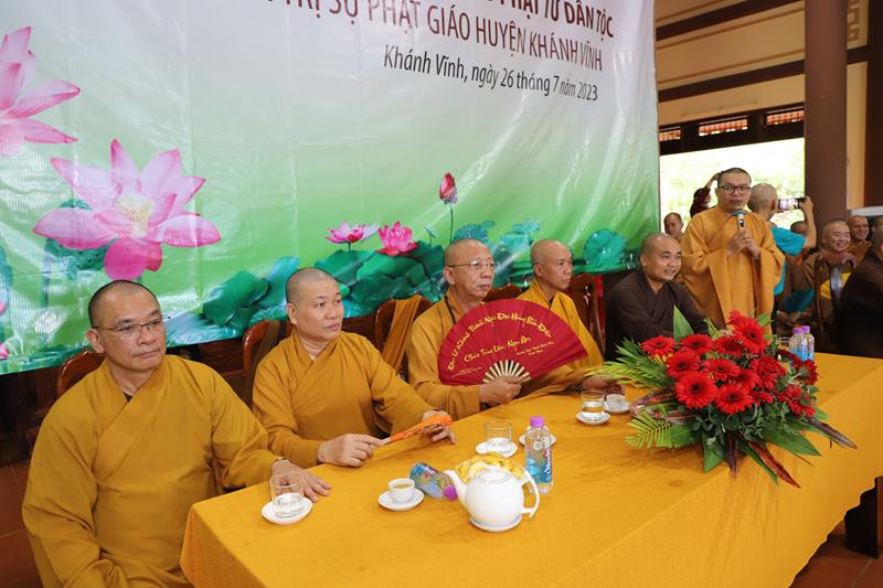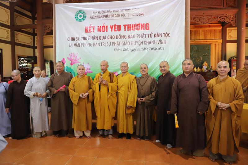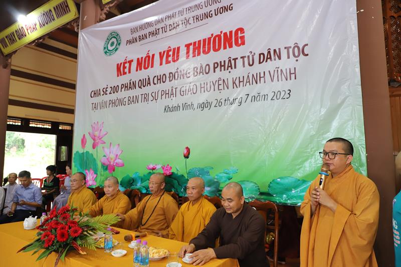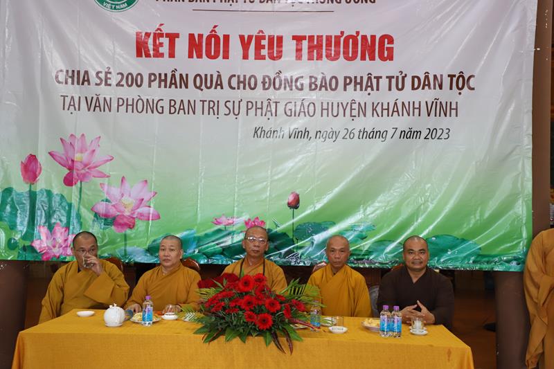 Thượng tọa Thích Huệ Giáo – Phó Phân ban PTDT TƯ – Trưởng Ban Hoằng pháp Tỉnh chia sẻ với bà con dân tộc cố gắng vươn lên vượt mọi khó khăn gian khó để ổn định cuộc sống, Thượng tọa gửi lời cảm ơn lãnh đạo chính quyền địa phương đã tạo điều kiện cho chư tôn đức Phân ban có cơ hội đến với đồng bào dân tộc thiểu số tại huyện Khánh Vĩnh, tỉnh Khánh Hoà
