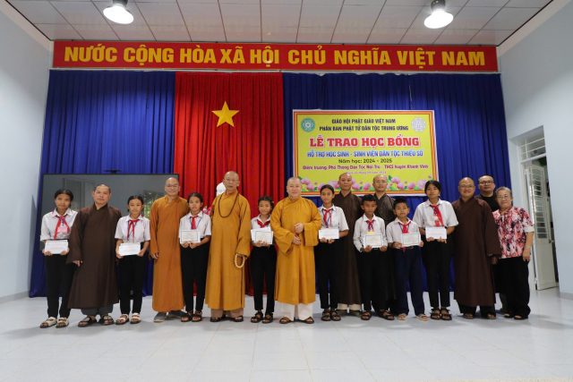 - Nhằm hỗ trợ cho con em đồng bào dân tộc thiểu số có thêm động lực vượt lên hoàn cảnh khó khăn trên con đường học tập, chiều ngày 26/9/2024, (24/8/Giáp Thìn), Phân ban Phật tử Dân tộc Trung ương kết hợp với Ban HDPT và Phân ban Phật tử Dân tộc tỉnh Khánh Hoà tổ chức lễ trao học bổng khuyến học hỗ trợ học sinh, sinh viên đồng bào dân tộc thiểu số tại điểm trường Phổ Thông Dân Tộc Nội Trú – THCS huyện Khánh Vĩnh, tỉnh Khánh Hoà.