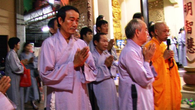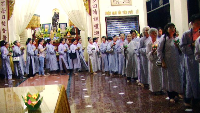 Thượng tọa khuyến tấn Phật tử tụng kinh Dược Sư, hướng dẫn đạo tràng niệm Phật, kinh hành, niệm danh hiệu “Nam mô Dược Sư Lưu Ly Quang Vương Phật”. Lễ truyền đăng, hàng nghìn ngọn hoa đăng rực sáng lung linh, hòa cùng nhịp khánh, tiếng mõ và âm thanh niệm Phật trầm hùng. Đêm Hoa đăng cầu nguyện quôc thái dân an, thế giới hòa bình, chúng sinh an lạc, cầu âm siêu dương thái