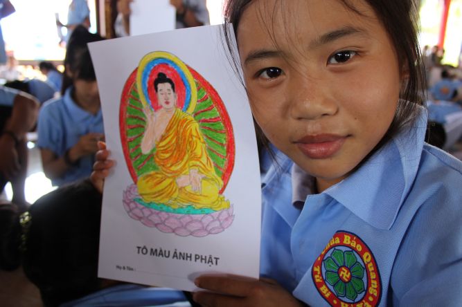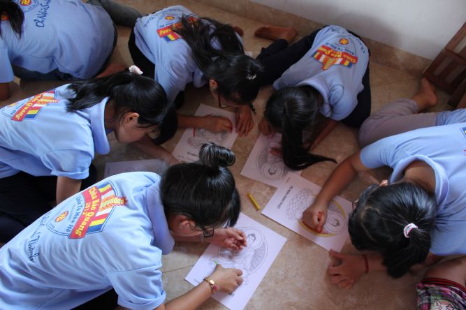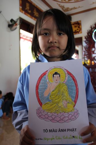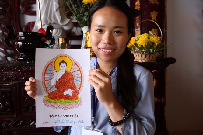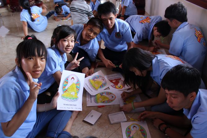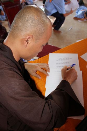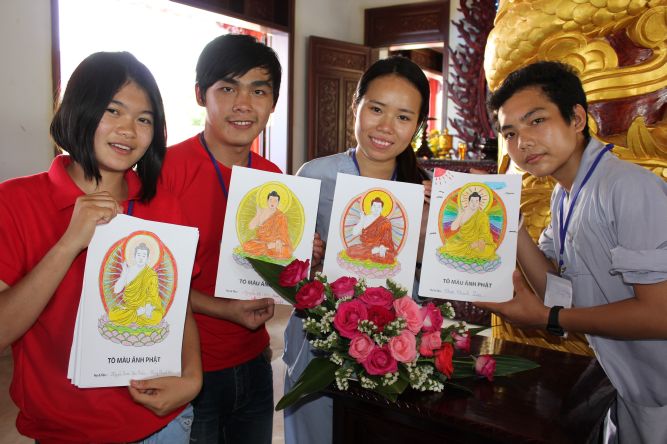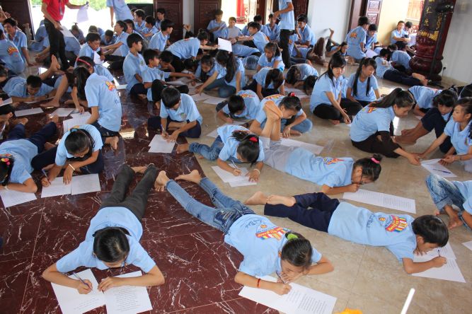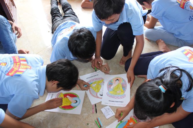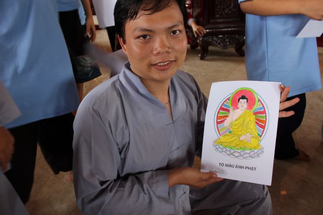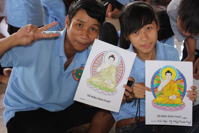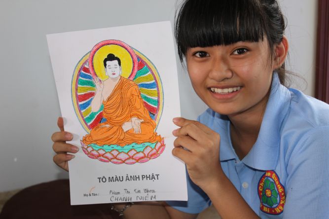 Cũng tại khóa tu “Ơn nghĩa sinh thành” này, ĐĐ. Thích Lệ Minh còn hướng dẫn các bạn trẻ viết chữ đẹp lời kinh Phật và tô tranh hình Đức Bổn Sư Thích Ca Mâu Ni Phật. Đại đức đã trực tiếp hướng dẫn các bạn trẻ ăn cơm trong chánh niệm theo nghi thức quá đường của Phật giáo, và cũng chính Thầy đã phát rất nhiều phần thưởng cho các bạn trẻ đạt thành tích xuất sắc trong hai phần thi tô tranh và viết lời kinh Phật.