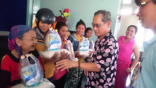 Ông Nguyễn Hùng Cường – Chủ tịch UBND xã Khánh Hiệp cùng Ban chấp hành Đoàn TNCS của xã đã có mặt tại Uỷ ban Nhân dân xã từ sớm để đón tiếp đoàn. Ông bà Nguyễn Công Lý đã tặng 100 suất quà, mỗi suất gồm 10 kg gạo thơm , 01 lít nước mắm, 01 kg đường và 01 lít dầu đậu nành, giá trị khoảng 200.000 đ/phần. Số quà này do gia đình, và bà Nguyễn Thị Thanh Mai đã vận động những người thân quen đóng góp . Được biết, cách đây vài tháng, đoàn đã tặng cho bà con của xã trên 200 chiếc áo khoát. Trong hoàn cảnh xã Khánh Hiệp bị mưa lũ vừa qua, mùa màng hư hại, thì số quà này tuy ít ỏi nhưng đã đến được với bà con kịp thời, đúng lúc “Một miếng khi đói bằng một gói khi no” Ông Chủ tịch UBND xã Khánh Hiệp đã thay mặt bà con chân thành cám ơn tấm lòng của đoàn và gia đình bà Nguyễn Thị Thanh Mai