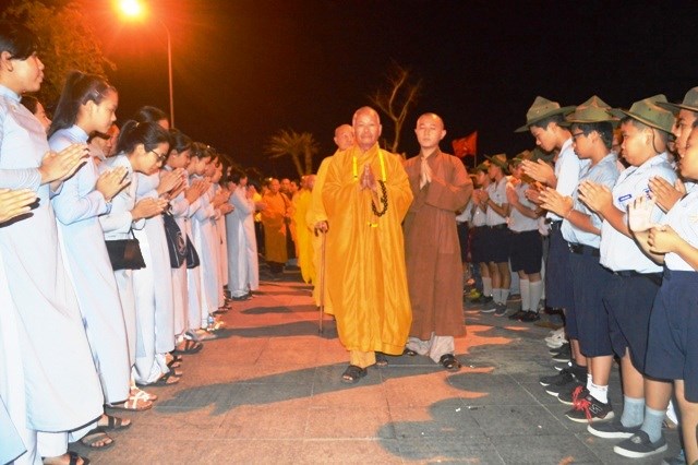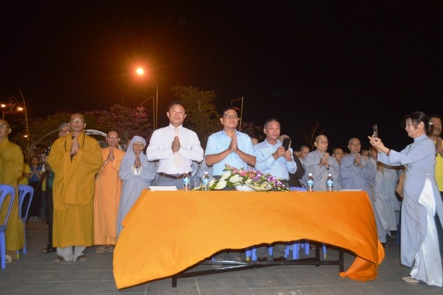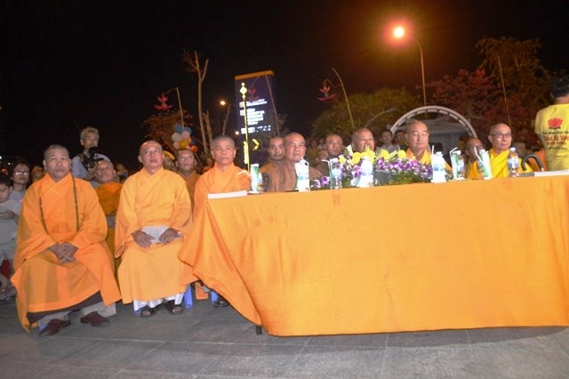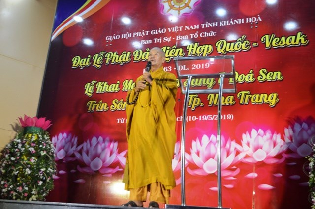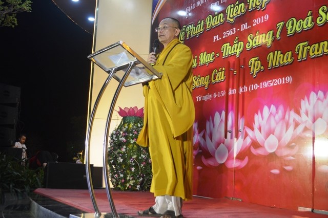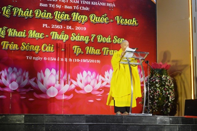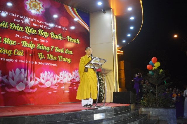HT. Thích Quảng Thiện, thành viên HĐCM, Chứng minh BTS, Chứng minh BTC đại lễ ban đạo từ tán thán công đức của chư Tôn Đức Tăng Ni BTS GHPGVN tỉnh đã thiết kế 7 đóa sen trên dòng sông cái Kính mừng Đại lễ, cám ơn các cấp chính quyền tỉnh, thành phố và địa phương đã cho phép GHPGVN tỉnh Khánh Hòa lần đầu tiên thực hiện chương trình Khai mạc thăp sáng 7 đóa sen kính mừng Đại lễ Vesaak 2019.