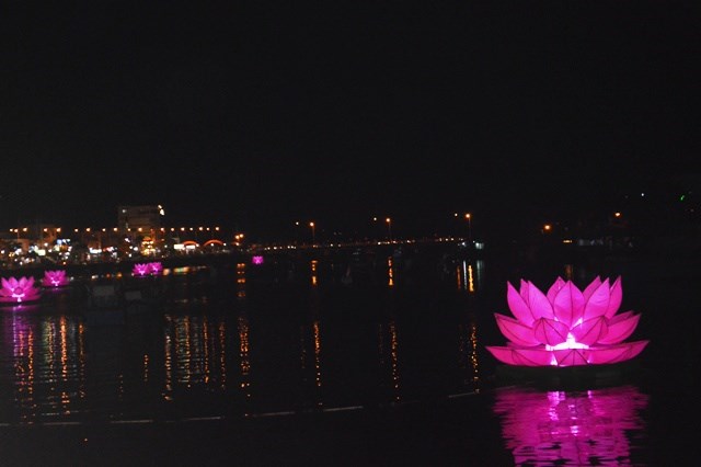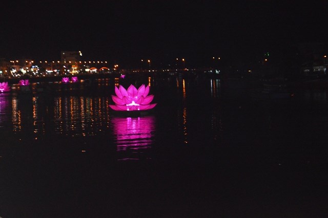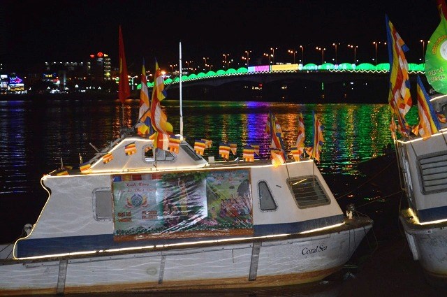 Sau phần niệm Phật hồi hướng, kết thúc buổi lễ là tiết mục bắn pháo hoa tầm thấp và thắp sáng Hoa đăng. 7 đóa sen sáng rực theo dòng chảy trên sông Cái Nha Trang báo hiệu niềm hân hoan của những người con Phật trên quê hương đất Khánh người Hòa kính mừng Đại lễ Phật đản Vesak 2019.