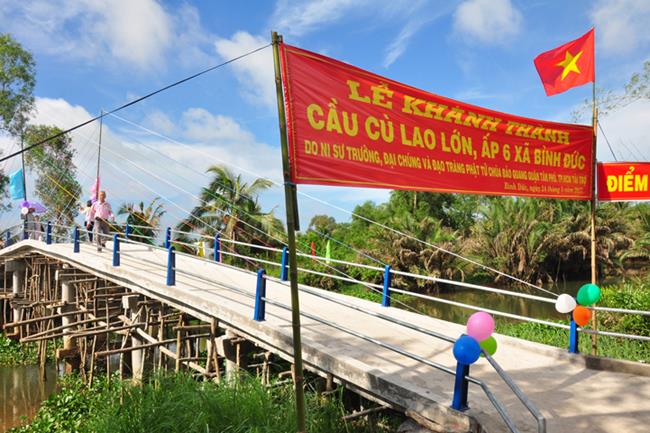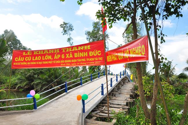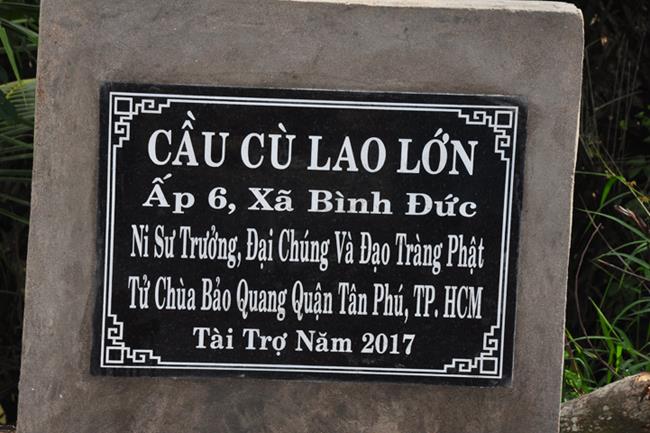 Cầu Cù Lao Lớn ở tại xã Bình Đức được khởi công xây dựng từ 3 tháng trước do Ban Từ thiện chùa Bảo Quang, quận Tân Phú, TP. HCM tài trợ 300 triệu đồng; nhân dân địa phương đóng góp 400 ngày công (khoảng 60 triệu đồng). Cầu được xây dựng bằng bê tông cốt thép, chiều ngang là 2.6 m, chiều dài là 45m, tải trọng 5 tấn, độ thông thuyền 7m.