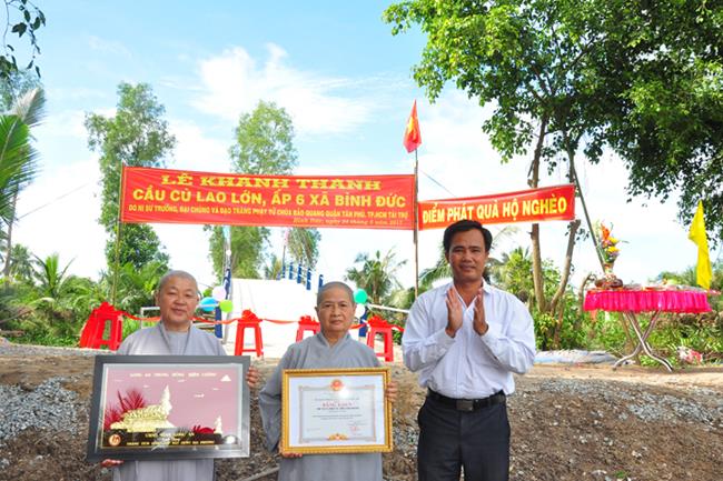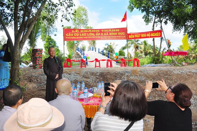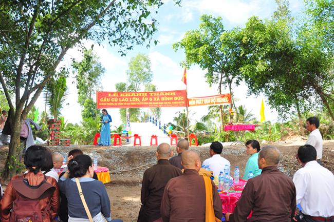 Phát biểu tại buổi lễ, ông Nguyễn Văn Tài – Phó Chủ tịch UBND xã Bình Đức nói lời tri ân đến lãnh đạo Phật giáo tỉnh LA và nhà tài trợ đã tạo điều kiện cho bà con nơi đây có được một cây cầu bê tông kiên cố, góp phần cải thiện đời sống địa phương và giúp các em học sinh thuận lợi đến trường.