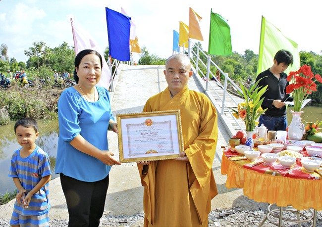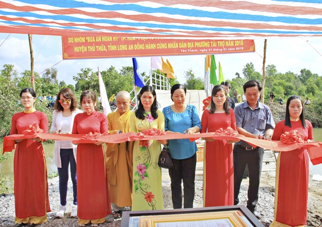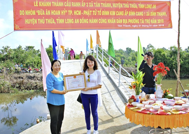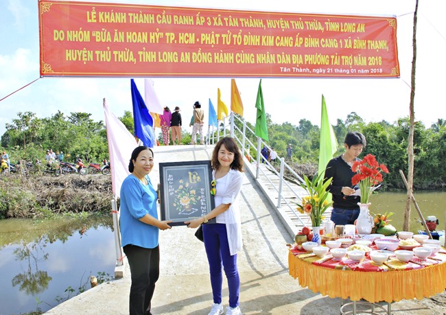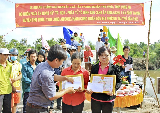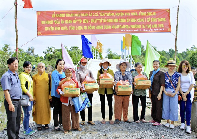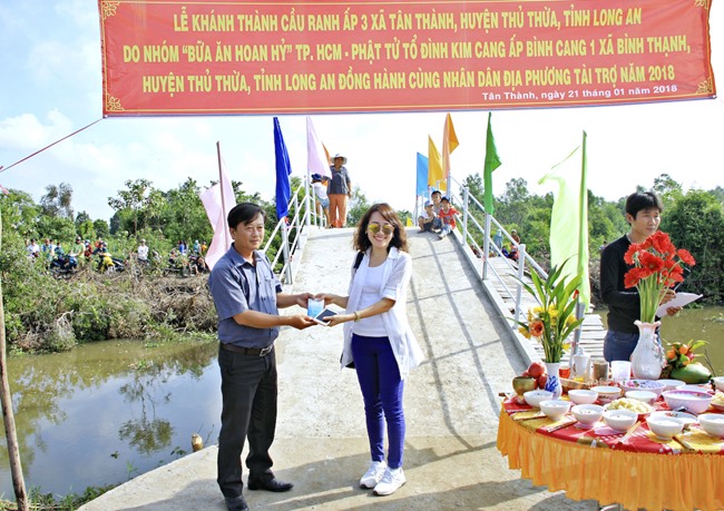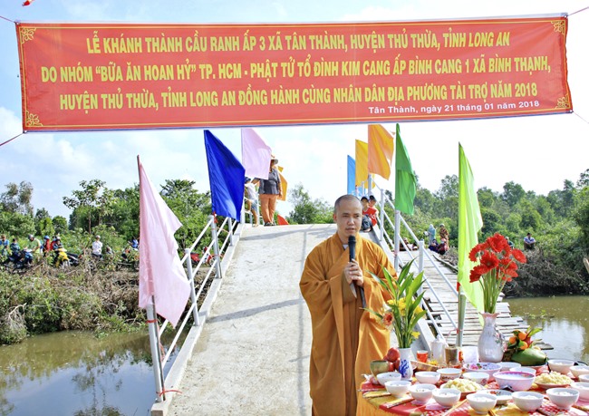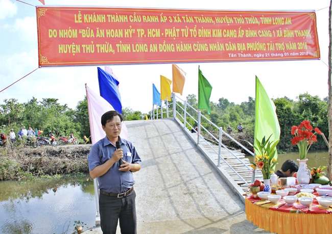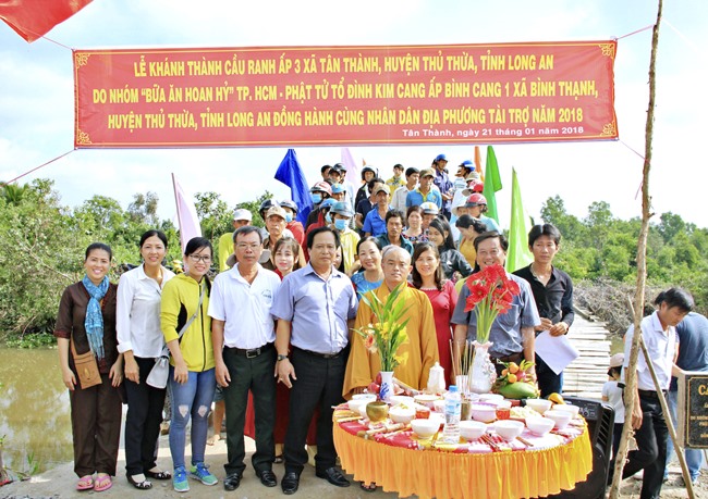 Đồng cảm với sự khó khăn ấy, Ban từ thiện Tổ đình Kim Cang, ấp Bình Cang 1, xã Bình Thạnh, huyện Thủ Thừa đã hướng dẫn nhóm “Bữa ăn Hoan hỷ” tại thành phố HCM – Phật tử Tổ đình Kim Cang tài trợ kinh phí xây dựng cầu Ranh, ấp 3 xã Tân Thành. Với tổng kinh phí là 156.000.000 đ (một trăm năm mươi sáu triệu đồng), nhà tài trợ ủng hộ 120.000.000 đ; phần còn lại do chính quyền địa phương và bà con trong thôn đóng góp.
