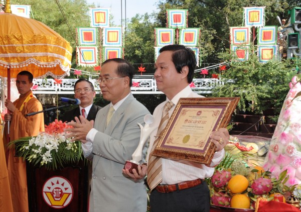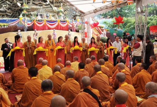 Tiếp theo, Hòa thượng Thích Quang Đạo ban đạo từ và phần Chư tôn Hòa thượng cùng ông Đinh Văn Vui, Tổng Giám đốc Công ty cổ phần Du lịch Văn hóa Suối Tiên cắt băng khánh thành công trình Thánh tượng.