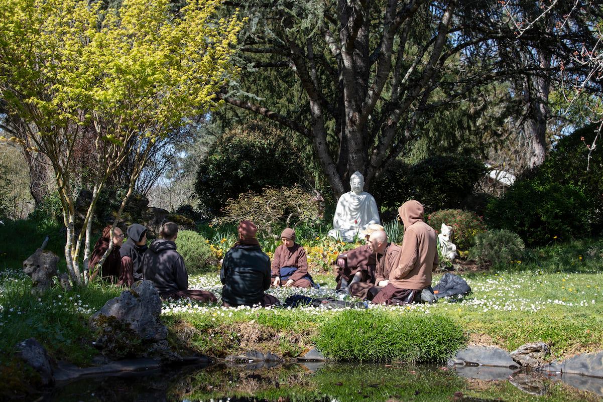 Ở Làng Mai, chúng tôi ăn thong thả. Chúng tôi ăn như một cộng đồng. Mọi người đều ngồi cho đẹp và chúng tôi đợi nhau để cùng bắt đầu một lần. Khi có một sư anh hay một sư chị ngồi ăn trong chánh niệm phía bên phải hay bên trái mình, bạn cảm thấy được nâng đỡ trong sự thực tập ăn trong chánh niệm. Trước khi bắt đầu một bữa ăn, chúng tôi thực tập năm điều Quán Niệm.