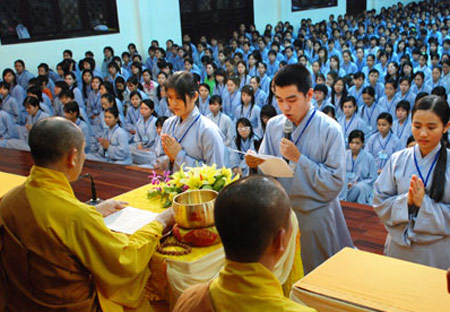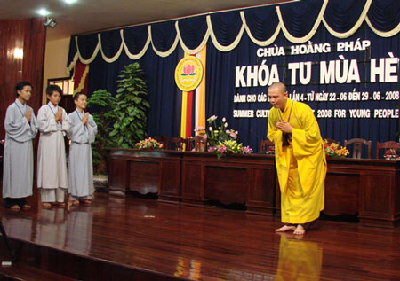 Lúc chúng tôi đi ngang qua nhiều em đã nhường lối, chắp tay chào những người khách mới đến làm chúng tôi không khỏi tò mò. Đoán biết được điều này ĐĐ.Thích Tâm Thành – người đón chúng tôi vào chùa cho biêt: “Bài học đầu tiên của các bạn trẻ trong khóa tu là học về oai nghi. Vẻ đẹp của oai nghi được thể hiện qua những tư thế, động tác, ngôn ngữ và cách tiếp xúc của các bạn trẻ trong đời sống hàng ngày. Các em được Ban Tô chức hướng dẫn cách chắp tay, cách lễ lạy, dáng đi, tư thế ngồi, cách để dép… Tất cả dường như rất mới mẻ đối với các em, bởi trong học đường các em chưa bao giờ được thực tập”.