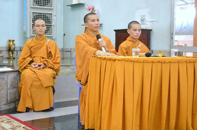 Trong buổi lễ, trước tiên ĐĐ Thích Tánh Khoan giải thích cho các em hiểu một cách gắn gọn ý nghĩa Quy y Tam bảo là gì.