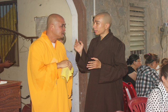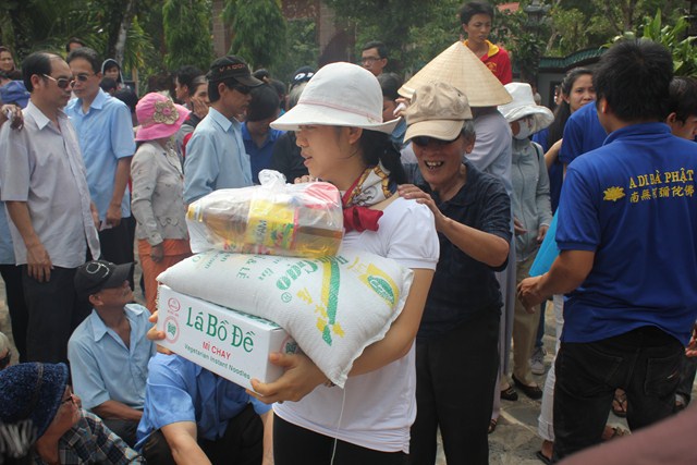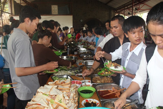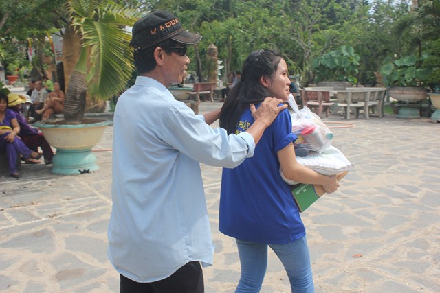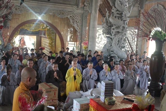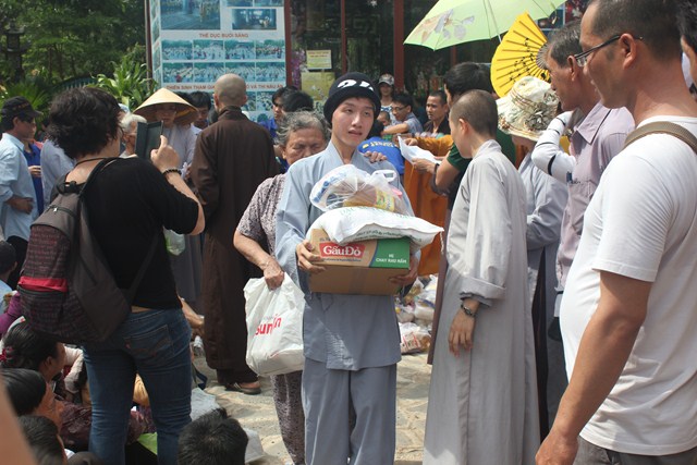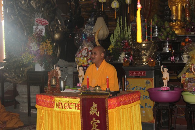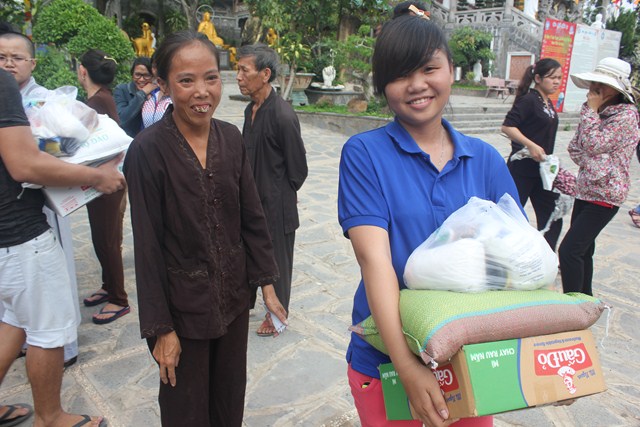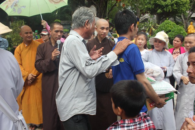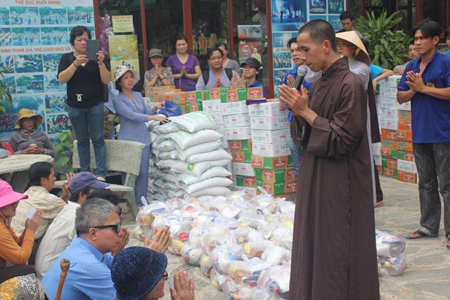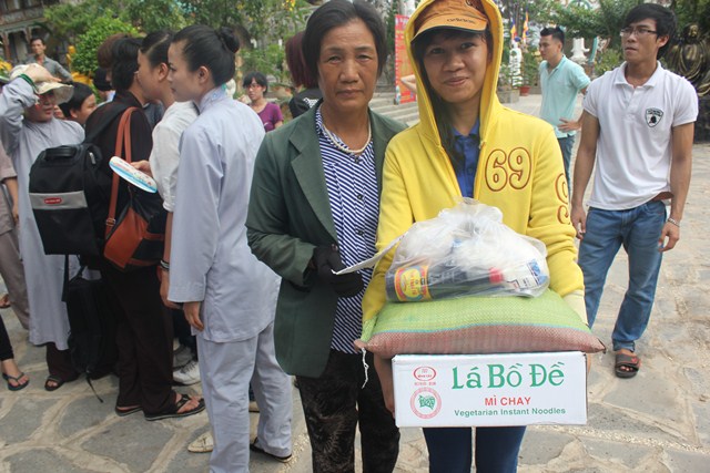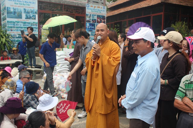 Sau thời tụng kinh tại Thiện viện, đoàn đã được Thượng tọa trụ trì chia sẻ một thời pháp thoại ngắn về “Ý Nghĩa Ngày Phật Đản”. Qua buổi chia sẻ này, các tu sinh đã hiểu hơn về ngày Phật đản cũng như những giá trị mà Ngài đã đem lại cho cuộc đời. Dùng buffe chay vào đúng ngọ thời, các tu sinh đã được tận hưởng những món ăn thuần khiết từ thiên nhiên, thực tập trải tâm từ đến chúng sanh. Đúng 3h00 chiều, dưới sự sắp xếp và chỉ đạo của Thượng tọa Trụ trì, đoàn đã phát 150 phần quà cho bà con tại huyện nhà. Phần quà gồm: 10kg gạo, 1 thùng mì, 1 bịch đường,1 bịch bột ngọt, 1 bịch muối,1 chai dầu ăn, 2 chai nước tương, 1 chai dầu, thuốc, 1 phong bì trị giá 100 ngàn. Tổng số tiền cho đợt từ thiện lần này trị giá trên 50 triệu đồng, do sự đóng góp của các nhà hảo tâm và các Phật tử gần xa. Sau đó đoàn đã cúng dường Tam Bảo nơi đây để thể hiện bổn phận của người Phật tử tại gia vào việc hộ trì chánh pháp.