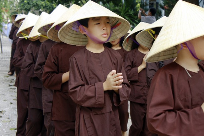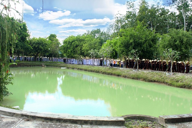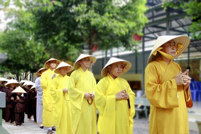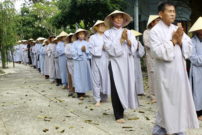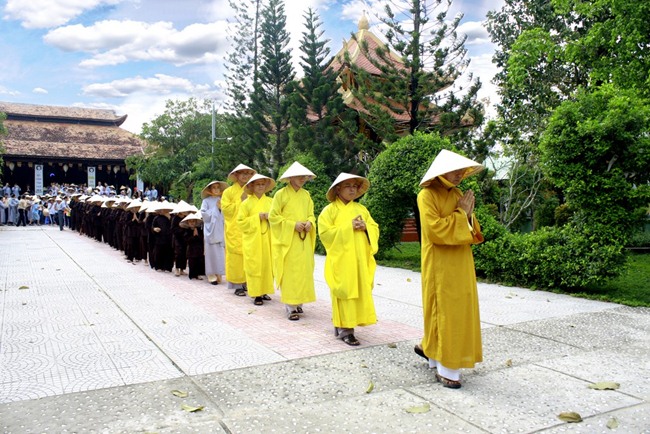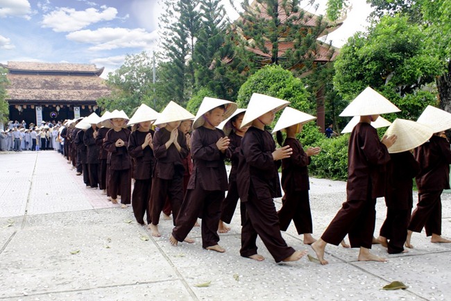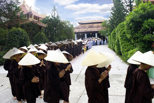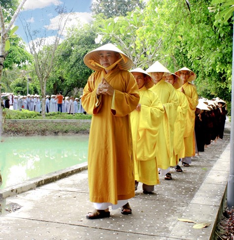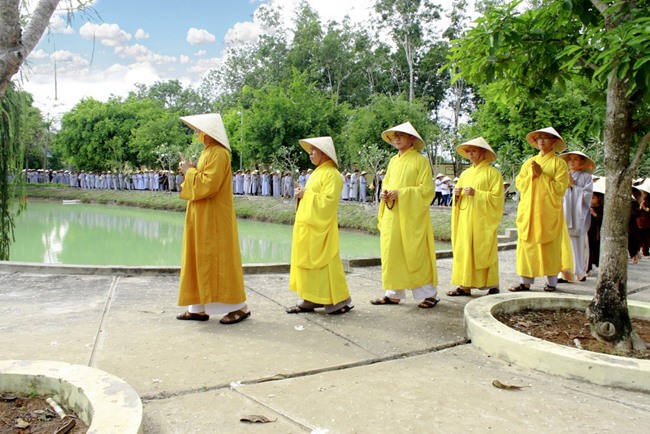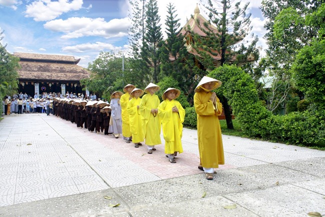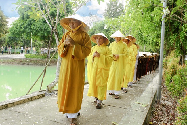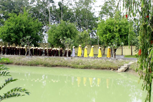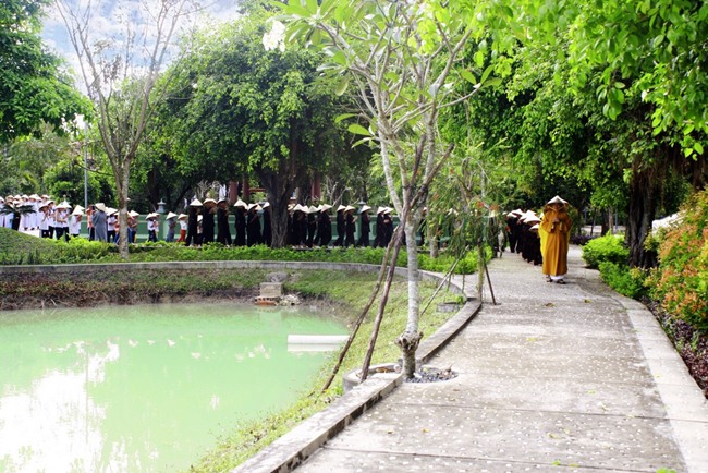 Tiếp theo đó, đại chúng đi thiền hành theo nhạc niệm Đức Bồ Tát Quán Thế Âm, và ngay lúc này đây các em thanh thiếu nhi Phật tử Hương Vân cũng đã tham gia đi thiền hành sau chân quý Thầy, quý Cô. Một khung cảnh thiền hành trãi dài thật đẹp và an lạc.