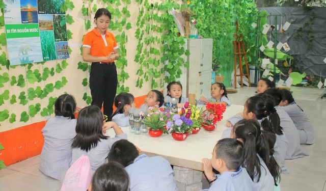 Sau giờ thọ trai, nghỉ trưa, nhằm giải tỏa cơn nóng bức mùa hè, trước khi đi bơi tại công viên nước, các bé lắng nghe huấn luyện viên chia sẻ về cách bơi an toàn, đồng thời phổ biến thêm phương pháp cứu hộ trong tình trạng đuối nước.