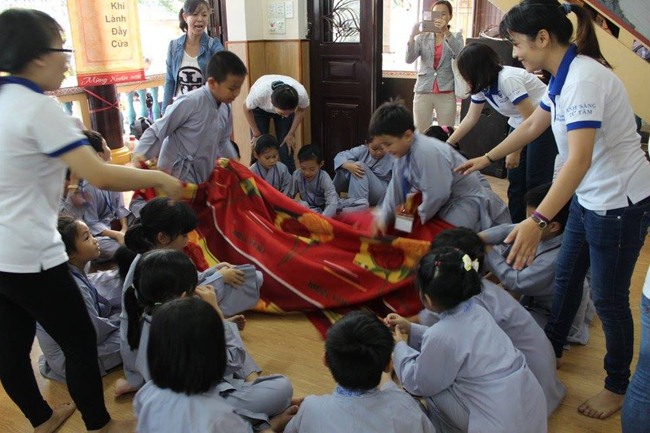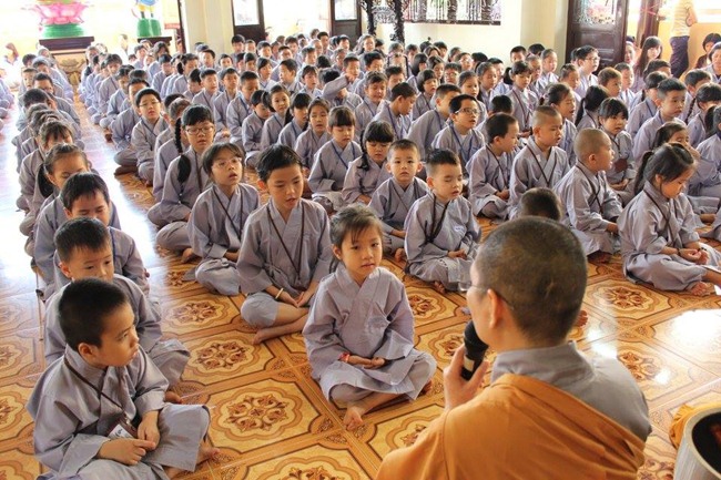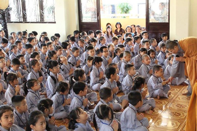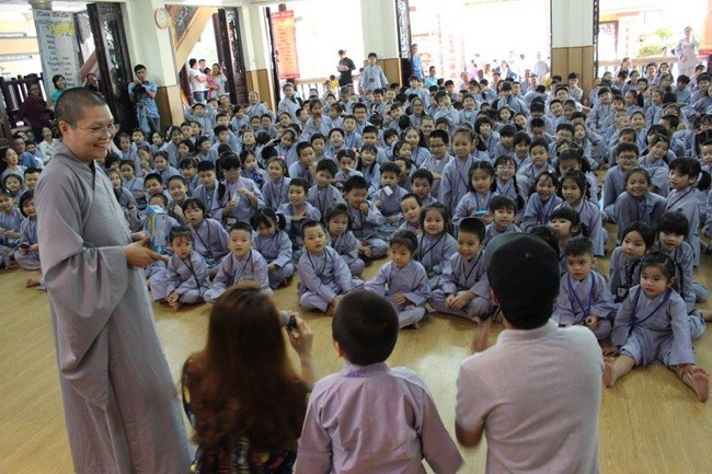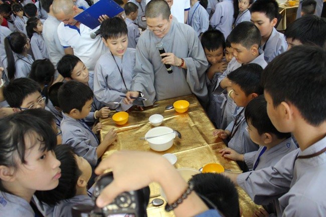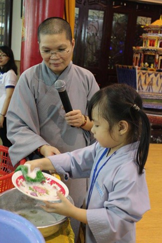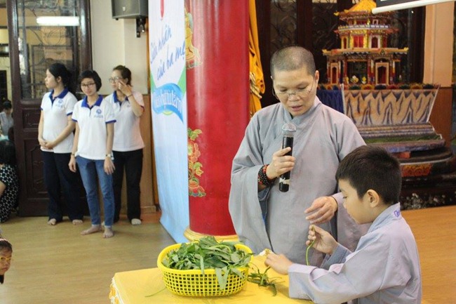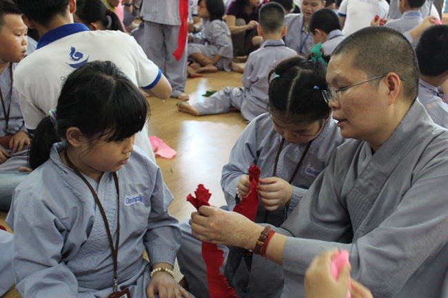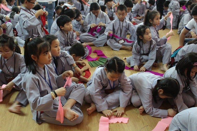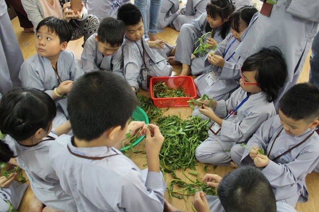 Tại khóa tu lần này, ngoài các chương trình thường kỳ như hướng dẫn các bé học cách xá chào và ngồi thiền, trì chú, xem phim, nghe kể chuyện và vấn đáp… còn có các chương trình hết sức ý nghĩa và rất thiết thực với các trẻ em sinh ra và lớn lên ở thành phố, đó là chương trình hướng dẫn cho các bé biết cách lặt rau, sắp xếp đồ đạc trong nhà, gấp chăn màn, quần áo, dọn bàn ăn, rửa chén bát, đặc biệt là phần hướng dẫn các bé làm hoa hồng giấy để tặng mẹ nhân ngày 8/3.