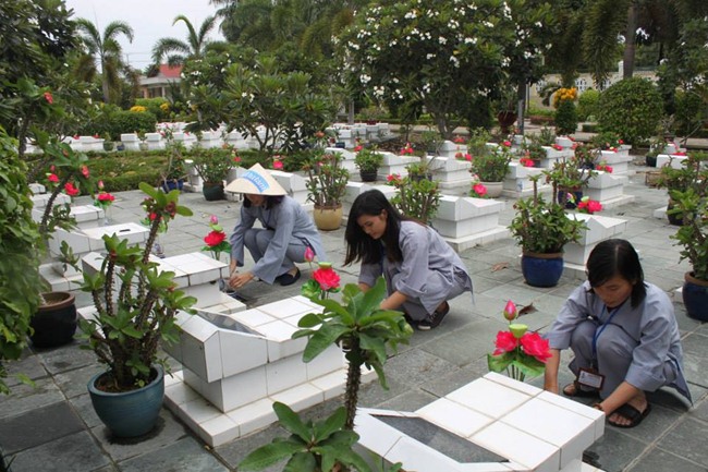 Rời khu tưởng niệm Nữ tướng Nguyễn Thị Định, các em tu sinh được hướng dẫn đến dâng hoa và thắp hương tưởng niệm các anh hùng liệt sĩ tại Nghĩa trang Anh hùng Liệt sĩ Bến Tre. Các em tu sinh đã thành kính dâng hoa và thắp hương tưởng niệm các anh hùng liệt sĩ đã anh dũng hy sinh vì độc lập tự do của tổ quốc, vì thế hệ tương lai.