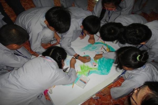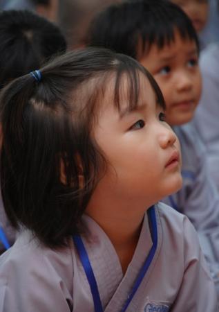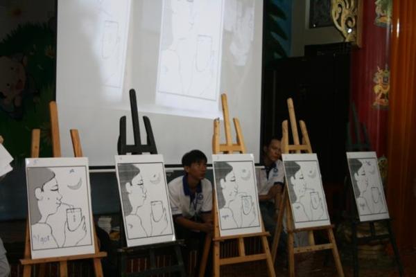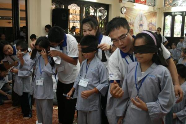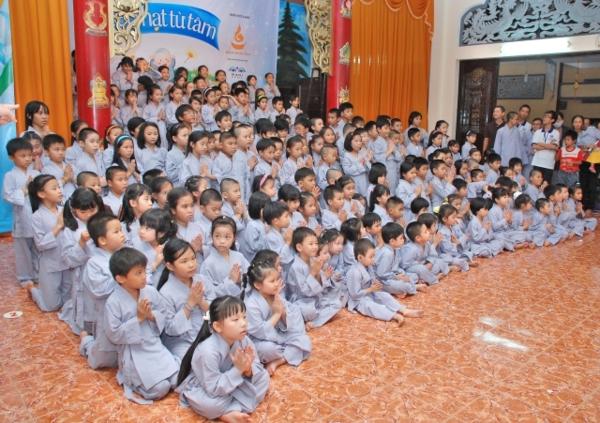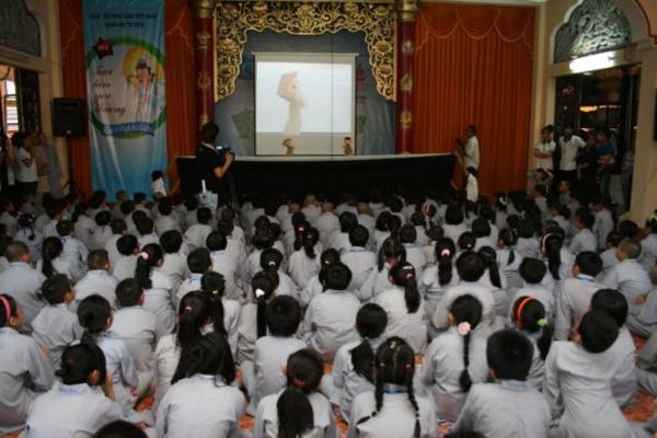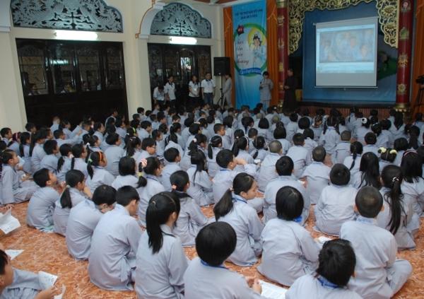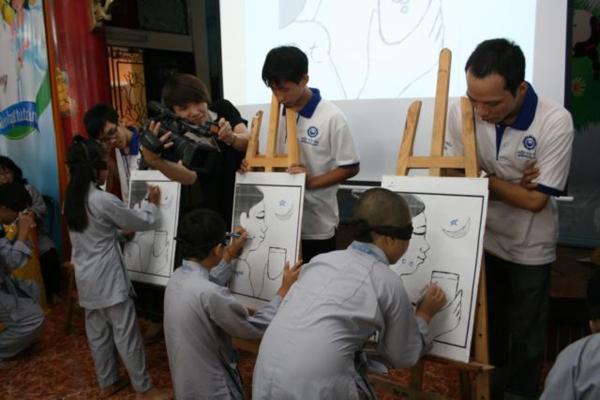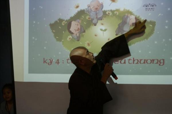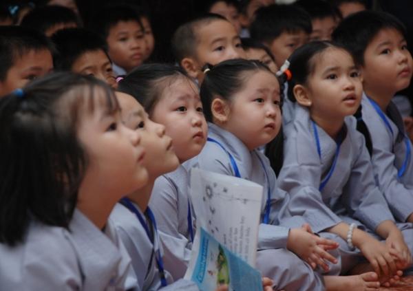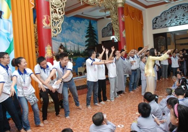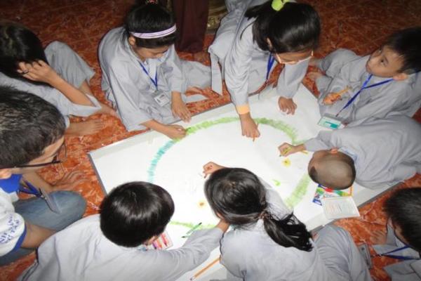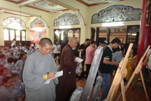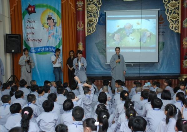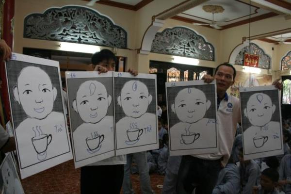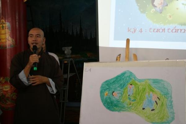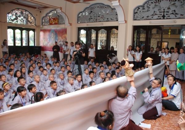 Các bé được xem hoạt cảnh múa rối về Lòng Hiếu Thảo Của Chim Oanh Vũ. Sau khi xem xong phần múa rối – Sư Cô Huệ Đức đặt câu hỏi liên quan qua câu chuyện nhằm hướng dẫn phụ huynh có cách giáo dục nhân cách cho trẻ thơ. Tiếp theo các bé chung sức tham gia nghệ thuật hội họa, có 25 đội vẽ tranh – ráp hình theo mẫu có sẵn.