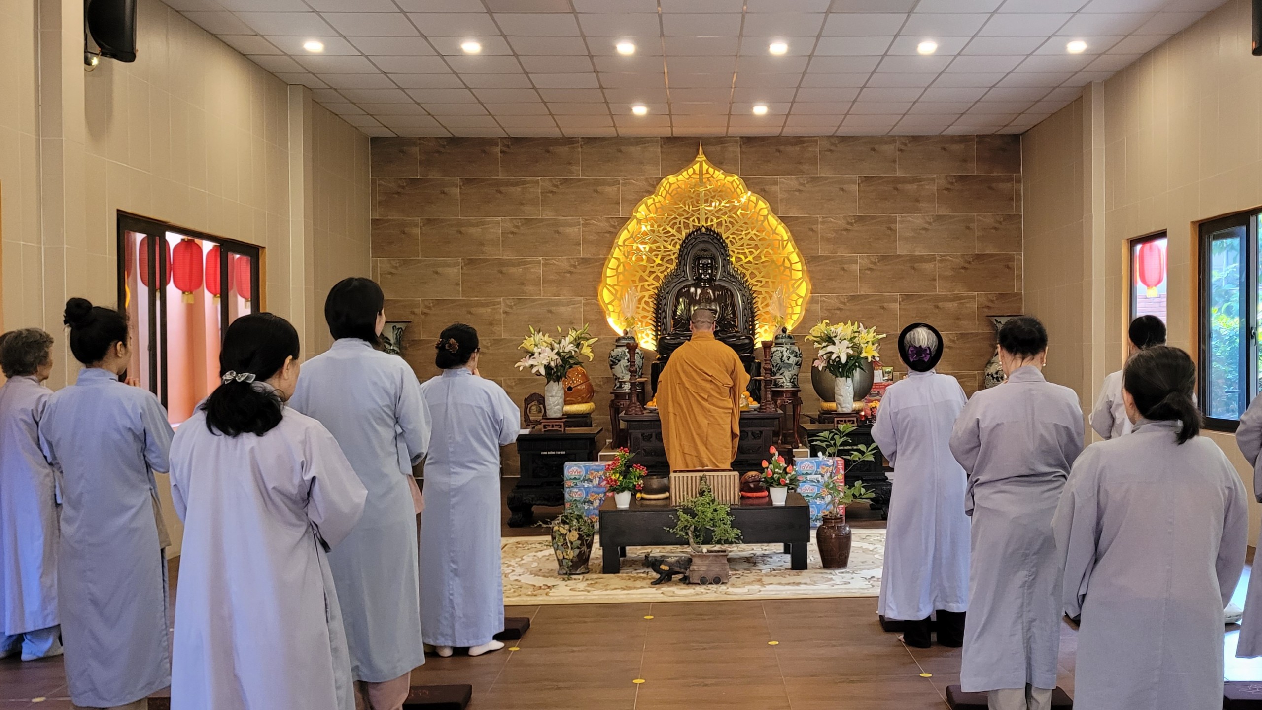 Chư Phật tử đã tập trung tại Tổ đường dâng lời tác bạch thỉnh sư – cung thỉnh Thượng tọa Trụ trì quang lâm Thiền đường Chơn Thanh truyền trao 8 điều đạo đức (Bát quan trai) để đại chúng hành trì trong một ngày một đêm.