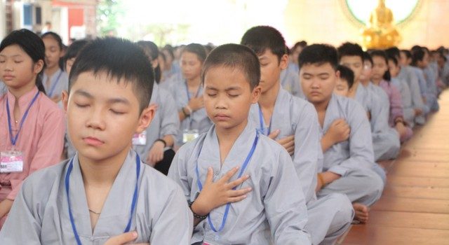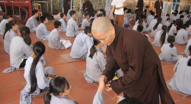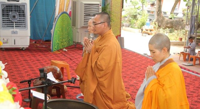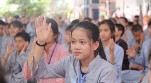 Buổi chiều cùng ngày, Thượng tọa trụ trì cùng chư tôn đức Tăng Ni đã tác pháp quy y Tam Bảo, truyền trao năm giới quý báu để mỗi bạn trẻ làm điểm tựa tâm linh, hoàn thiện nhân cách, tránh xa các điều ác. Bên cạnh đó, các bạn còn được Sư cô Diệu Tấn hướng dẫn lạy Phật theo nhạc và tập khí công Phật gia để tu tập hạnh lành, rèn luyện sức khỏe.