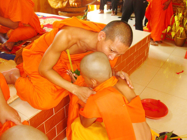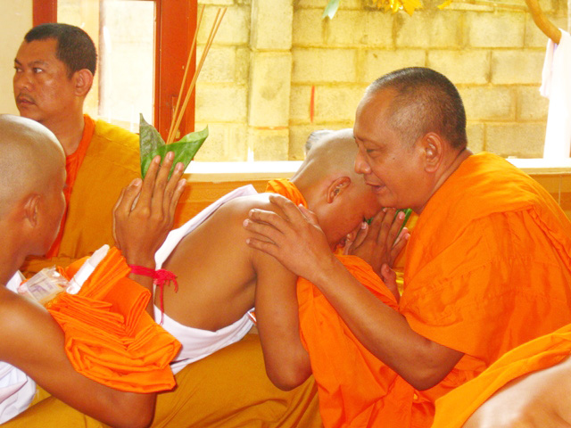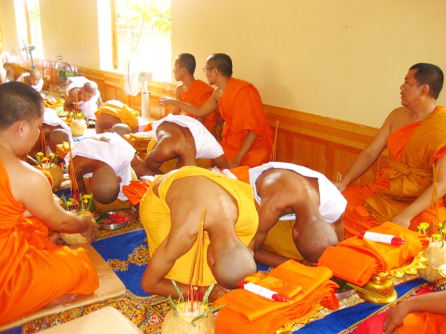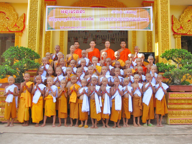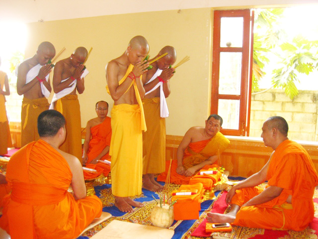 Sư Trụ trì chùa đảnh lễ HT Viện chủ xin cử hành lễ xuất gia cho Tập thể giới tử. Tất cả tu sinh thực hành tiến trình xin giới, và lễ xuất gia tiến hành theo nghi thức PGNT Khmer (giới tử hôm nay trông lạ mắt vì được xuống tóc và cạo sạch lông mày) chỉ chuyên tâm tu học từ đây.