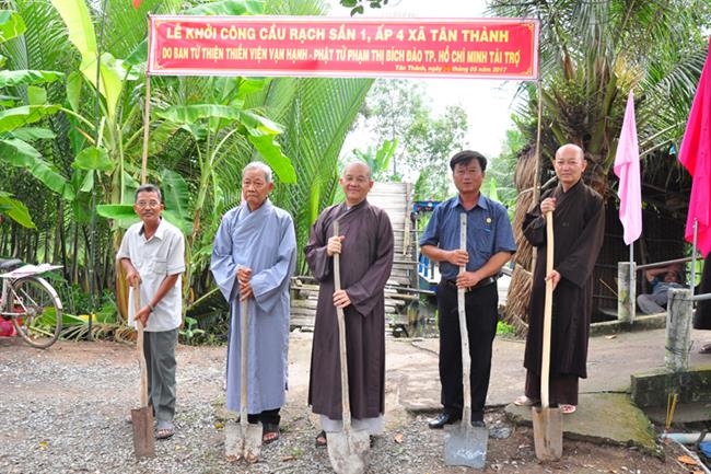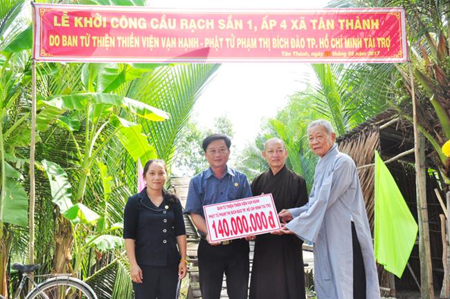 Đại diện nhà tài trợ HT Thích Minh Thiện – UV HĐTS, Phó Trưởng Ban Hoằng pháp TƯ, Trưởng BTS GHPGVN tỉnh Long An phát biểu. Hòa thượng tán dương công đức đối với Phật tử Tâm Tín đã làm cầu nối vận động nhiều mạnh thường quân xây dừng nhiều cây cầu tại tỉnh Long An, đặc biệt là xã Tân Thành huyện Thủ Thừa. Hòa thượng cũng tri ân đến Hòa thượng Chân Nguyên viện chủ Thiền Viện Vạn Hạnh, TP. HCM , Ban từ thiện Thiền Viện Vạn Hạnh và Phật tử Phạm Thị Bích Đào đã tài trợ công trình này.