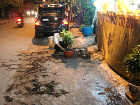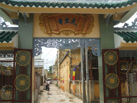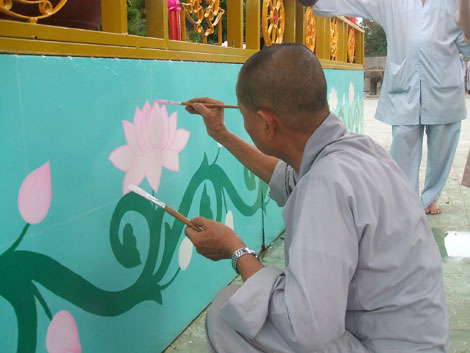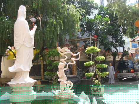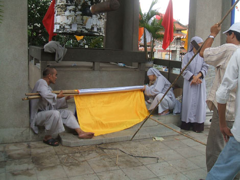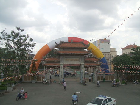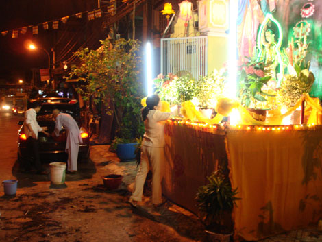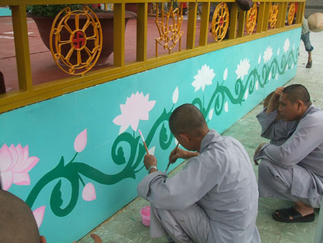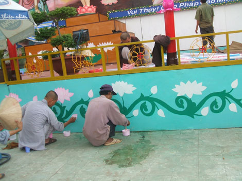 Phật tử đang trang trí lối vào chùa Thiên Trúc