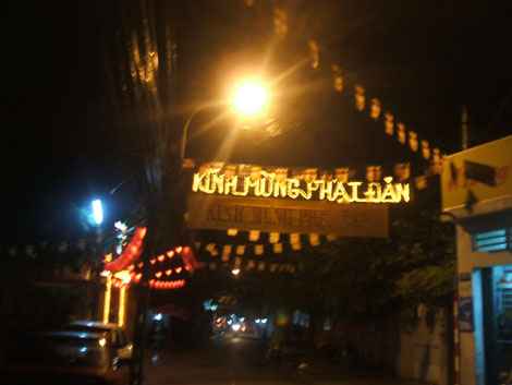 Biểu ngữ mừng Phật đản tại khu dân cư