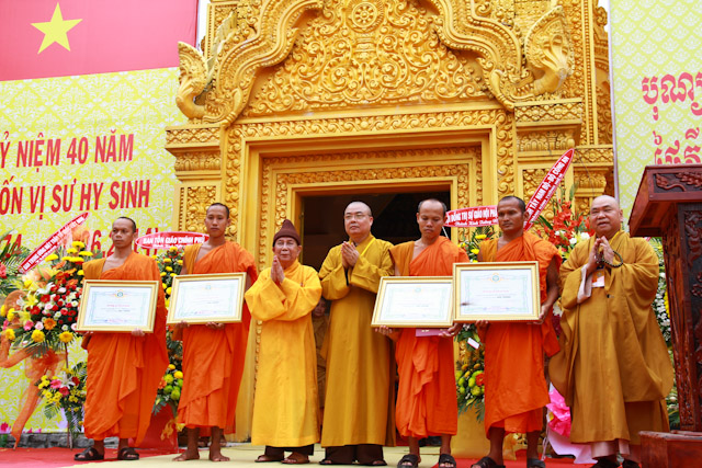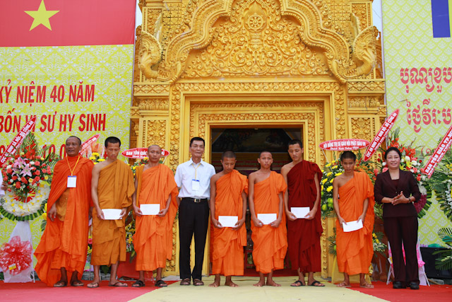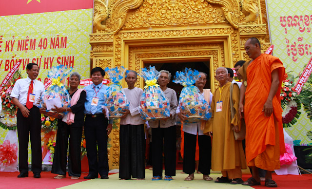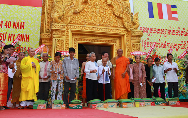 Cuối buổi lễ, Ban tổ chức đã trao tặng những phần quà đến 4 hộ gia đình của các vị sư đã hy sinh, như là một sự tri ân và báo ân Nhà nước và Phật giảo Tỉnh. Đồng thơi, Ban tổ chức cũng đã trao 29 phần Học bổng Tăng,Ni và Học sinh nghèo, cùng các phần quà cho đồng bào nghèo tại huyện Châu Thành – Kiên Giang.