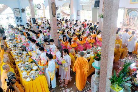 Mở đầu buổi lễ là tiếng hát của các ca sĩ, Phật tử và tiết mục dâng hoa cúng dường mười phương chư Phật, chư tôn đức Tăng Ni để thể hiện lòng hạnh hiếu, báo đáp công ơn thầy tổ.