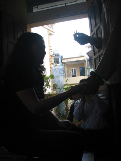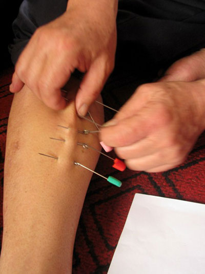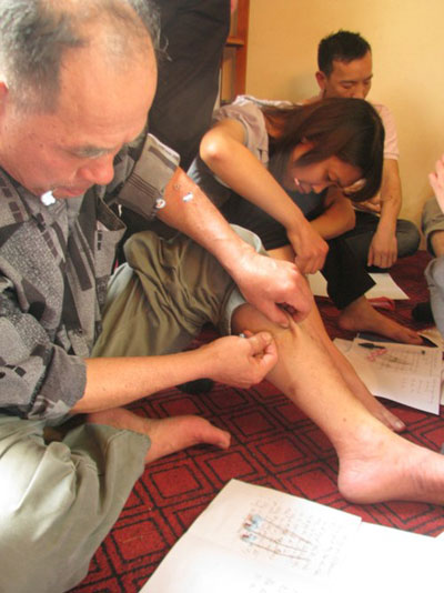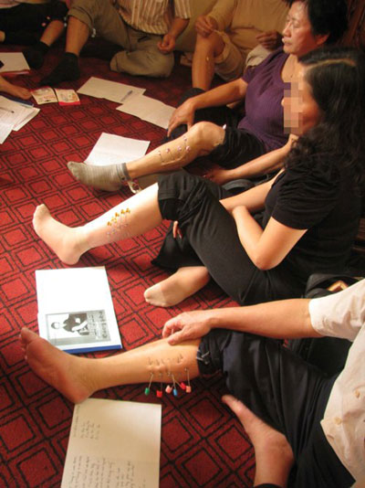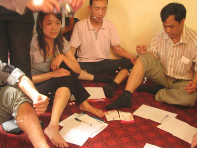 Dường như đặt sự tin tưởng tuyệt đối ở danh sư, học viên cầm kim tự xuyên qua bụng chân, bụng tay một cách không ngần ngại. Có những người xuyên kim vào chân nhanh thoăn thoắt như xuyên qua thân cây chuối, những cũng có những người mướt mải mồ hôi hý hoáy, dùng lực rất nhiều mới xuyên được một kim. Nhưng rốt cục cũng không có ai bỏ cuộc. Và có lẽ khi chứng kiến những cảnh này, người hoảng sợ lại chính là những người không tham gia.
