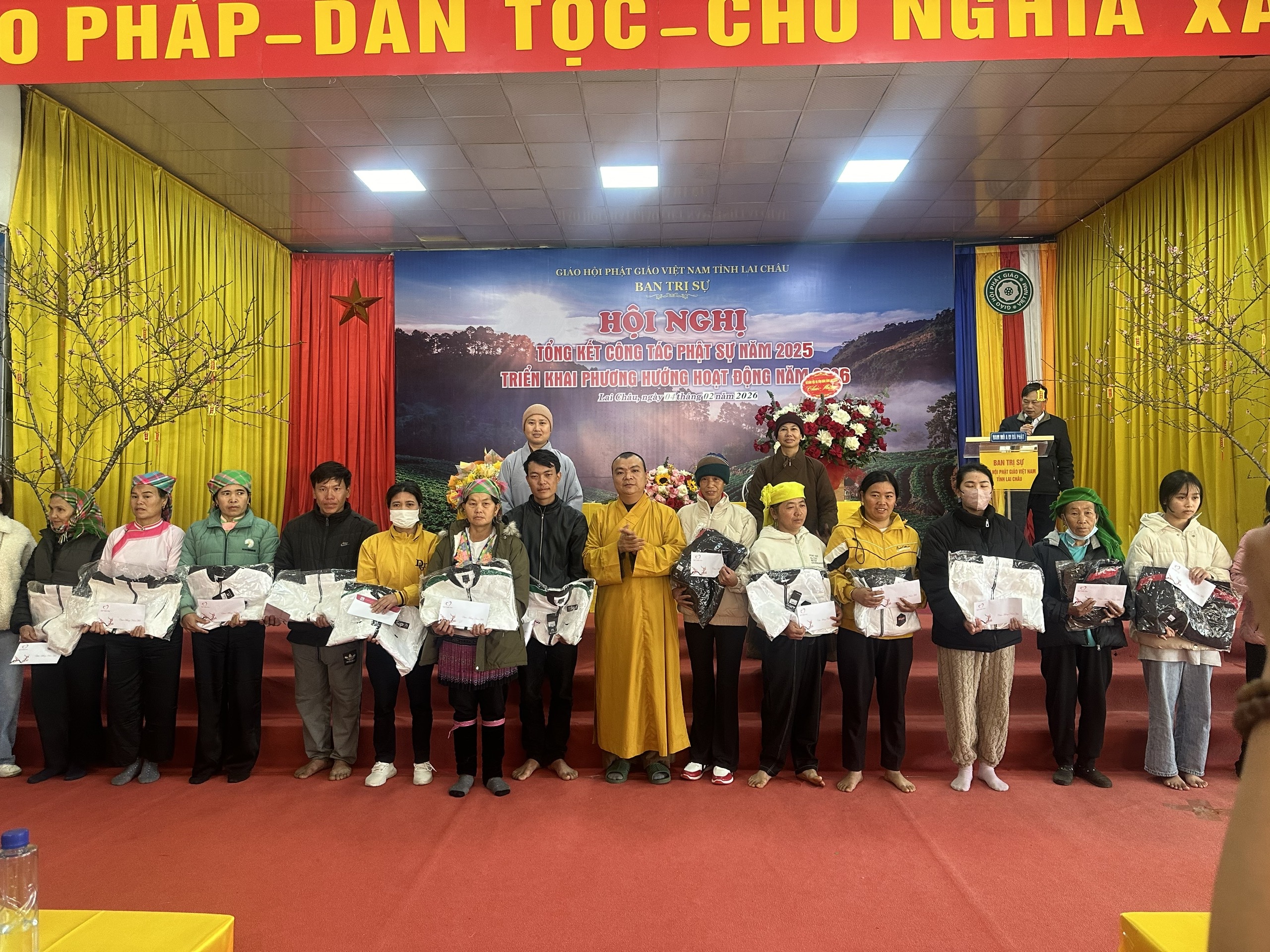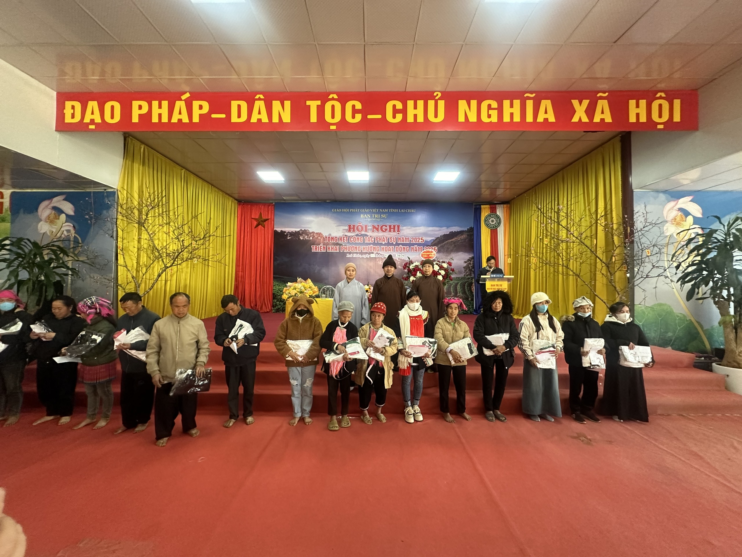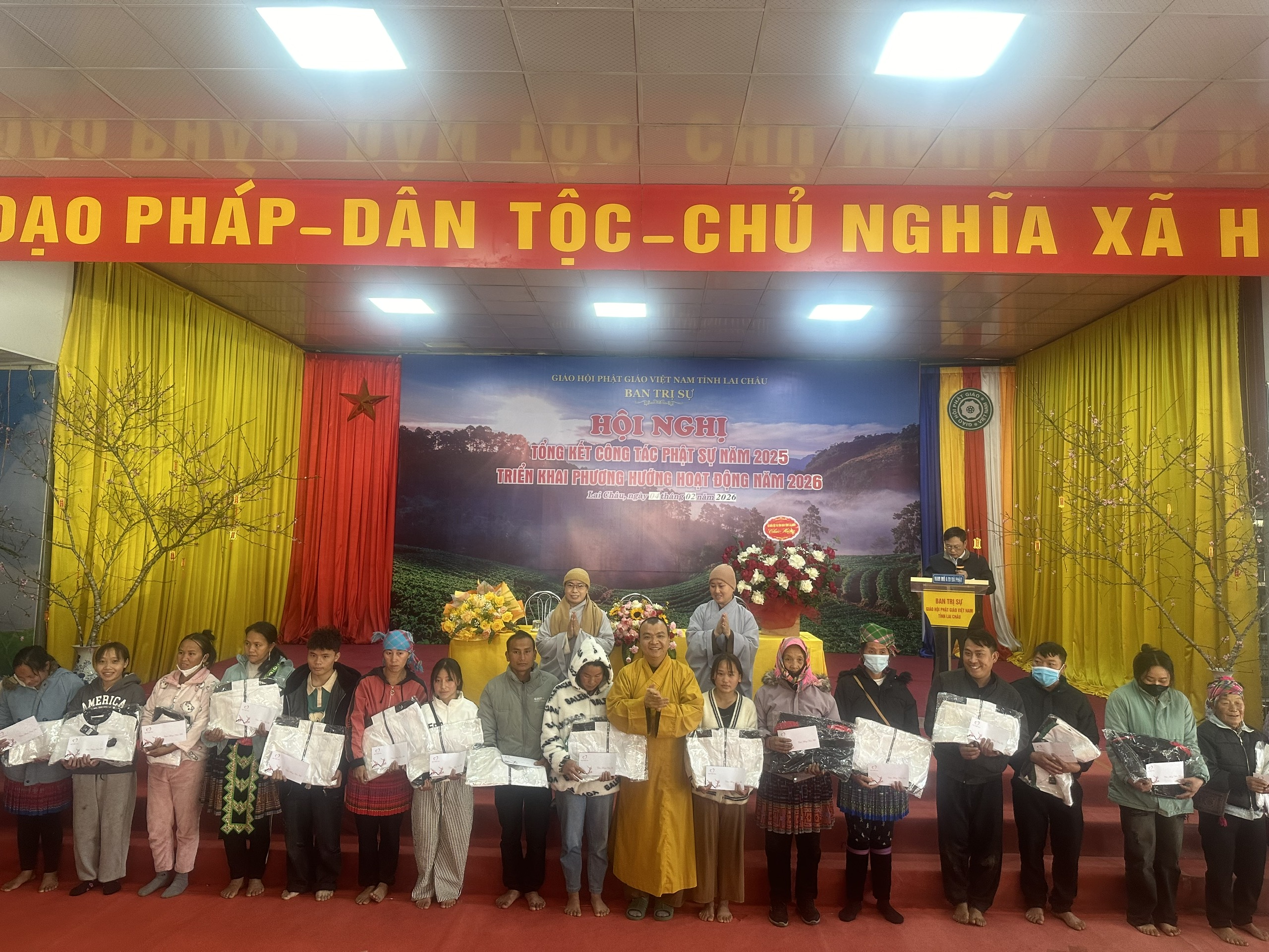 Nhân dịp này, Tăng Ni, Phật tử tỉnh Lai Châu đã dâng hoa chúc mừng Hòa thượng Thích Thanh Huân được Hội đồng Chứng minh GHPGVN tấn phong giáo phẩm Hòa thượng tại Đại nghị lần thứ III vừa qua. Ban Tổ chức Hội nghị phối hợp với Quỹ Thiện Tâm – Tập đoàn Vingroup trao 500 suất quà, tổng trị giá 400 triệu đồng, hỗ trợ các hộ gia đình có hoàn cảnh khó khăn trên địa bàn hai phường Tân Phong và Đoàn Kết, góp phần giúp bà con đón Tết Bính Ngọ an vui, đầm ấm.