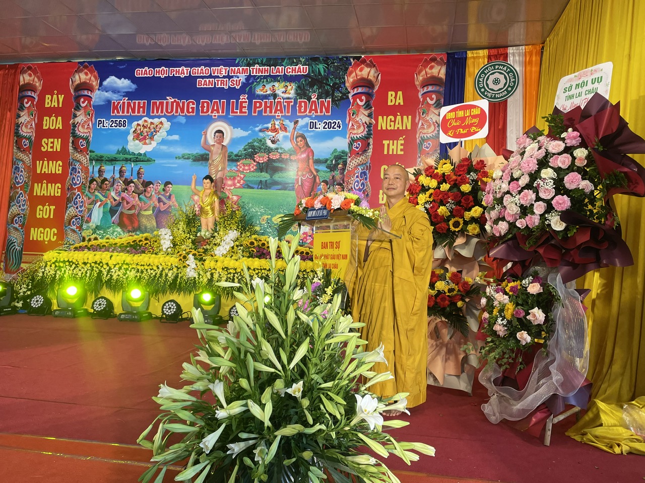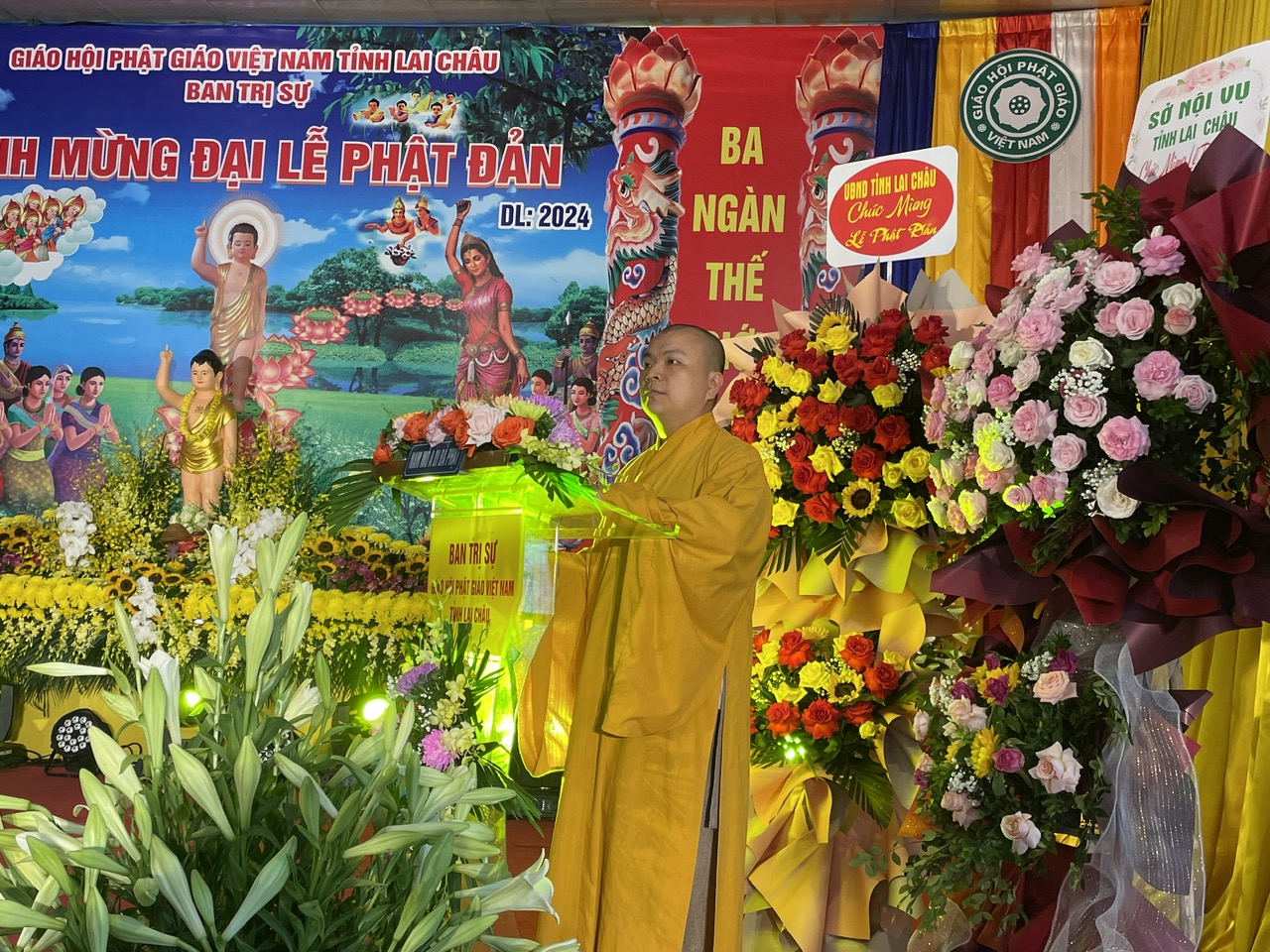 Tiếp đến, Thượng toạ Thích Thanh Huân đã cung tuyên bức Thông điệp Phật đản quan trọng của Đại lão Đức Pháp chủ GHPGVN. Đại đức Thích Minh Nhật đọc diễn văn Phật đản tràn đầy tình đạo nghĩa đời, niềm hạnh phúc của người con Phật trên quê hương Lai Châu: “Hôm nay, trên mảnh đất Lai Châu lịch sử anh hùng, nơi biên cương địa đầu Tổ quốc. Chúng ta cùng nhau vân tập về Trụ sở Tỉnh hội – Chùa Linh Sơn, để nhất tâm hướng về ngày Đức Phật Bản Sư Thích Ca Mâu Ni đản sinh lần thứ 2648. Hòa chung với không khí tưng bừng của nhịp đập non sông đất nước, tưng bừng kỷ niệm trọng thể 70 năm ngày chiến thắng lịch sử Điện Biên Phủ lừng lẫy năm châu, trấn động địa cầu 07/5/1954 – 07/5/2024. Kỷ niệm 45 năm Cuộc chiến đấu bảo vệ biên giới phía Bắc của Tổ quốc 17/02/1979 – 17/02/2024. Âm vang khí thế kỷ niệm 115 năm thành lập tỉnh, 75 năm thành lập Đảng bộ tỉnh, 20 năm chia tách, thành lập tỉnh Lai Châu, là sự kiện quan trọng của Đảng bộ, chính quyền, nhân dân các dân tộc tỉnh nhà.”.