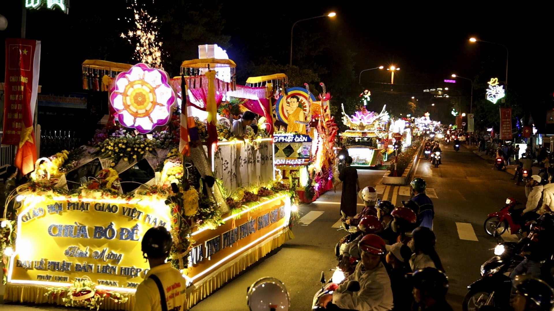 Xuất phát từ Tổ Đình Linh Quang – Đoàn xe hoa diễu hành qua các đường phố chính trung tâm Tp ĐàLạt Tối 14/4/ÂL