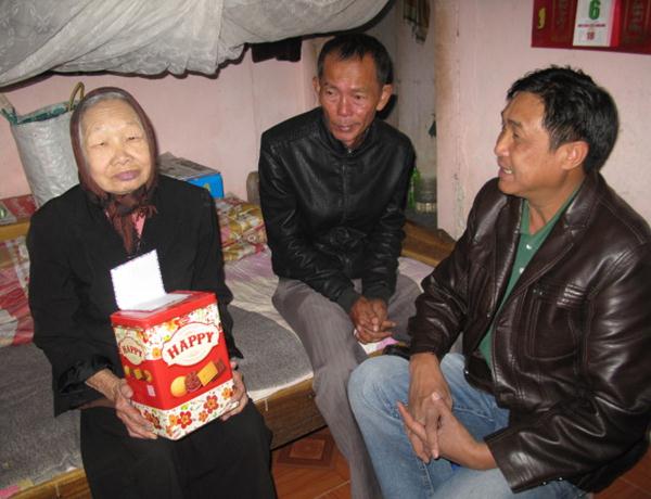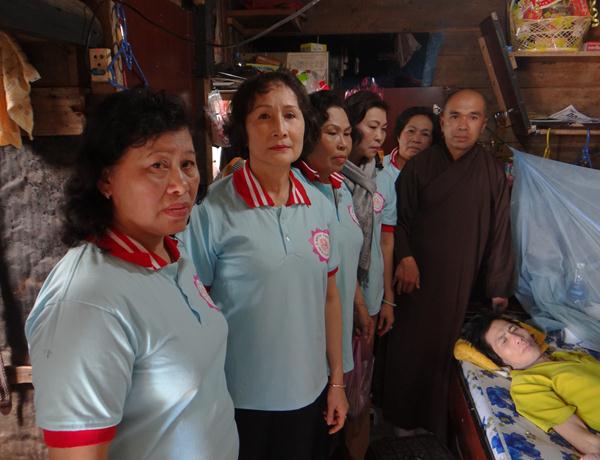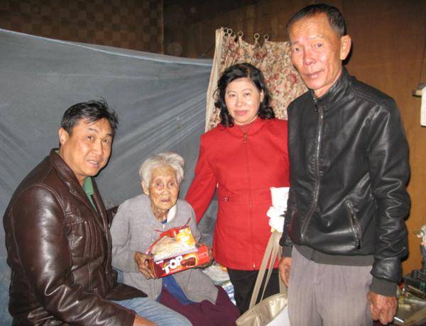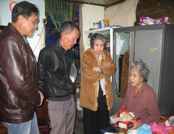 Trong căn nhà ván đã cũ mục được người hàng xóm thương tình cho ở nhờ, cụ bà nguyễn thị em 86 tuổi , không con cháu, sống hẩm hiu đơn lẻ nhờ vào tình thương của bà con hàng xóm, từ hơn 10 năm nay, cụ là một trong 42 trường hợp được ban từ thiện phật giáo trợ cấp thường xuyên hàng tháng 300.000 đồng, giúp các cụ vơi đi phần nào khó khăn, thiếu thốn trong cuộc sống .