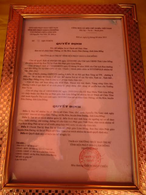 Trong niềm vui hoan hỷ, HT. Thích Pháp Chiếu đã trao quyết định cho vị tân trụ trì là Sư cô Thích Nữ Chúc Tâm , qua đó Sư cô đã có những lời phát nguyện trước sự chứng minh của chư tôn giáo phẩm, sẽ cố gắng sách tấn tu tập hơn nữa, gây dựng ngôi Tam bảo để đưa Phật pháp vào cuộc sống người dân, làm cho công tác Phật sự địa phương ngày một đi lên và có ý nghĩa “lợi đạo, ích đời”.