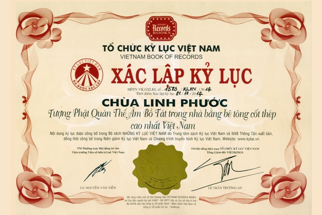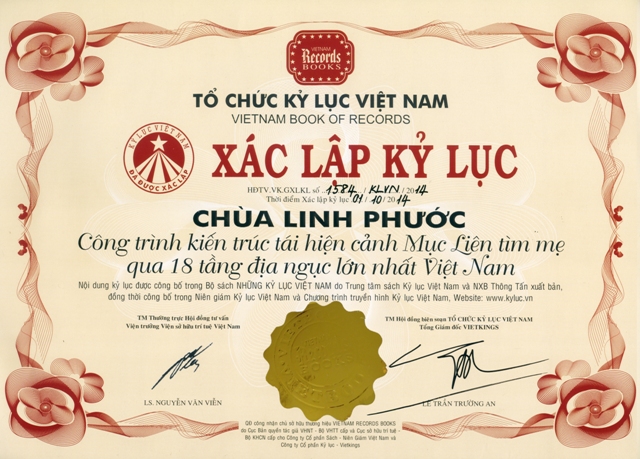 Đồng thời nhân dịp này Trung Tâm Sách Kỷ lục Việt Nam đã xác lập hai kỷ lục cho Chùa Linh Phước: Công trình kiến trúc tái hiện cảnh Mục Liên tìm mẹ qua 18 tầng địa ngục lớn nhất Việt Nam và Tượng Quán Thế Âm Bồ Tát trong nhà bằng bê tông cốt thép cao nhất Việt Nam.