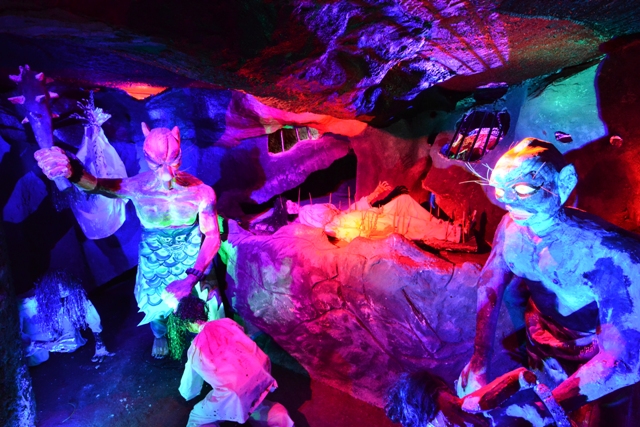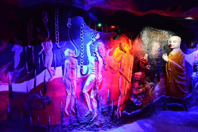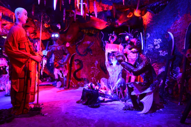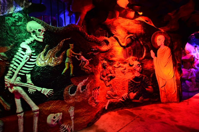 Công trình Bảo điện Quan Âm, chính giữa là tượng Mẹ hiền Quan Âm với dung nghi từ hòa cao 17m, xung quanh là 324 tượng cao 3,7m, được thiết kế ba tầng, thể hiện sự trường tồn của ngôi Tam bảo. Ngoài ra còn có công trình tái hiện cảnh giới Mục Kiền Liên Tìm Mẹ qua 18 cửa ngục, dựng lại bức tranh sống động về nhân quả nghiệp báo và lòng hiếu thảo. Tôn giả Mục Kiên Liên gian nan qua các cửa ngục để cứu mẹ mình, thoát khỏi cảnh khổ ác đạo. Cảnh địa ngục này cũng chính là nhắc cho chúng ta biết tránh con đường âm u tăm tối khổ sở, khuyên con người làm lành lánh dữ, tu tập hướng thiện để tự cứu mình và báo hiếu ơn nghĩa sinh thành.