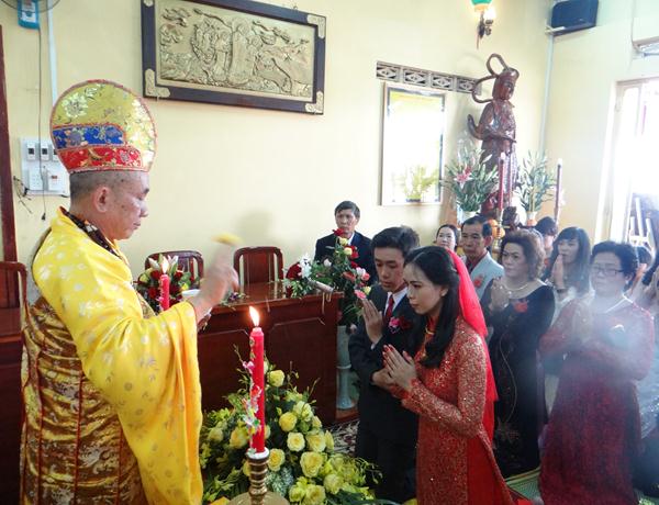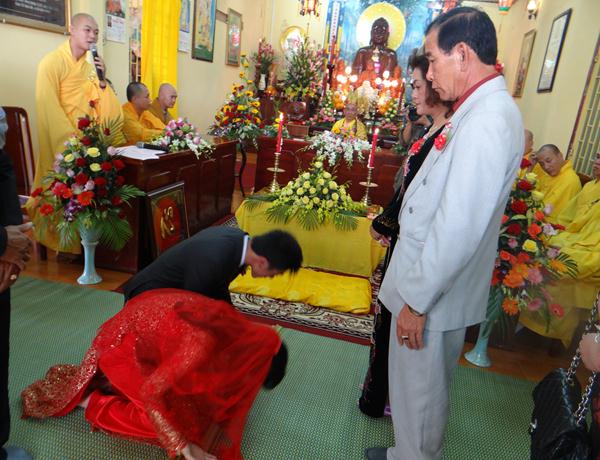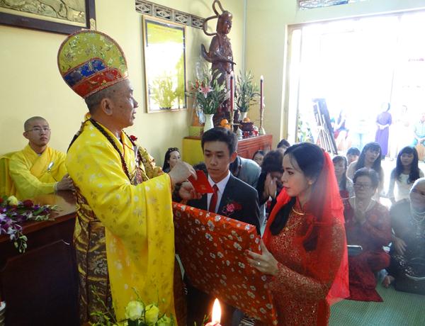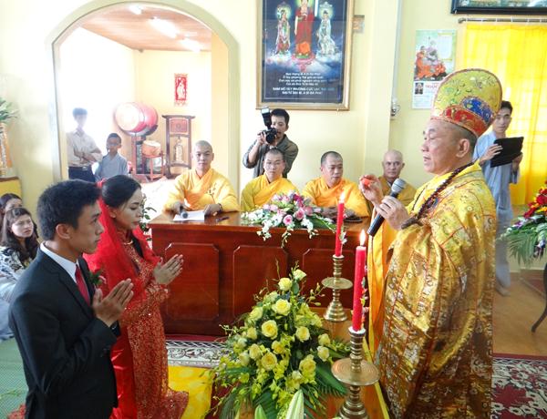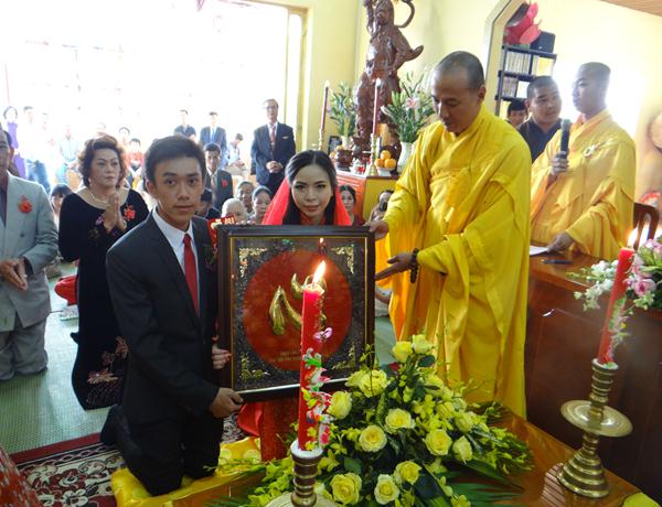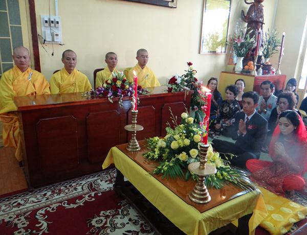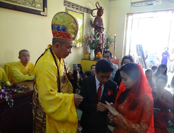 Trong không khí trang nghiêm, hoan hỷ, thanh tịnh dưới sự chứng minh của chư tôn đức và quan viên hai họ, đôi tân lang, tân nương trao nhẫn cưới cho nhau . Thượng tọa ân cần chỉ dạy : “ “ Bách nhẫn thành kim” trăm điều nhẫn sẽ mang lại nhiều điều lành tốt đẹp quí hơn vàng , từ đó gia đình sẽ mãi mãi hạnh phúc, an vui … xây dựng một xã hội phồn vinh, tốt đẹp vì mỗi gia đình là một tế bào của xã hội …